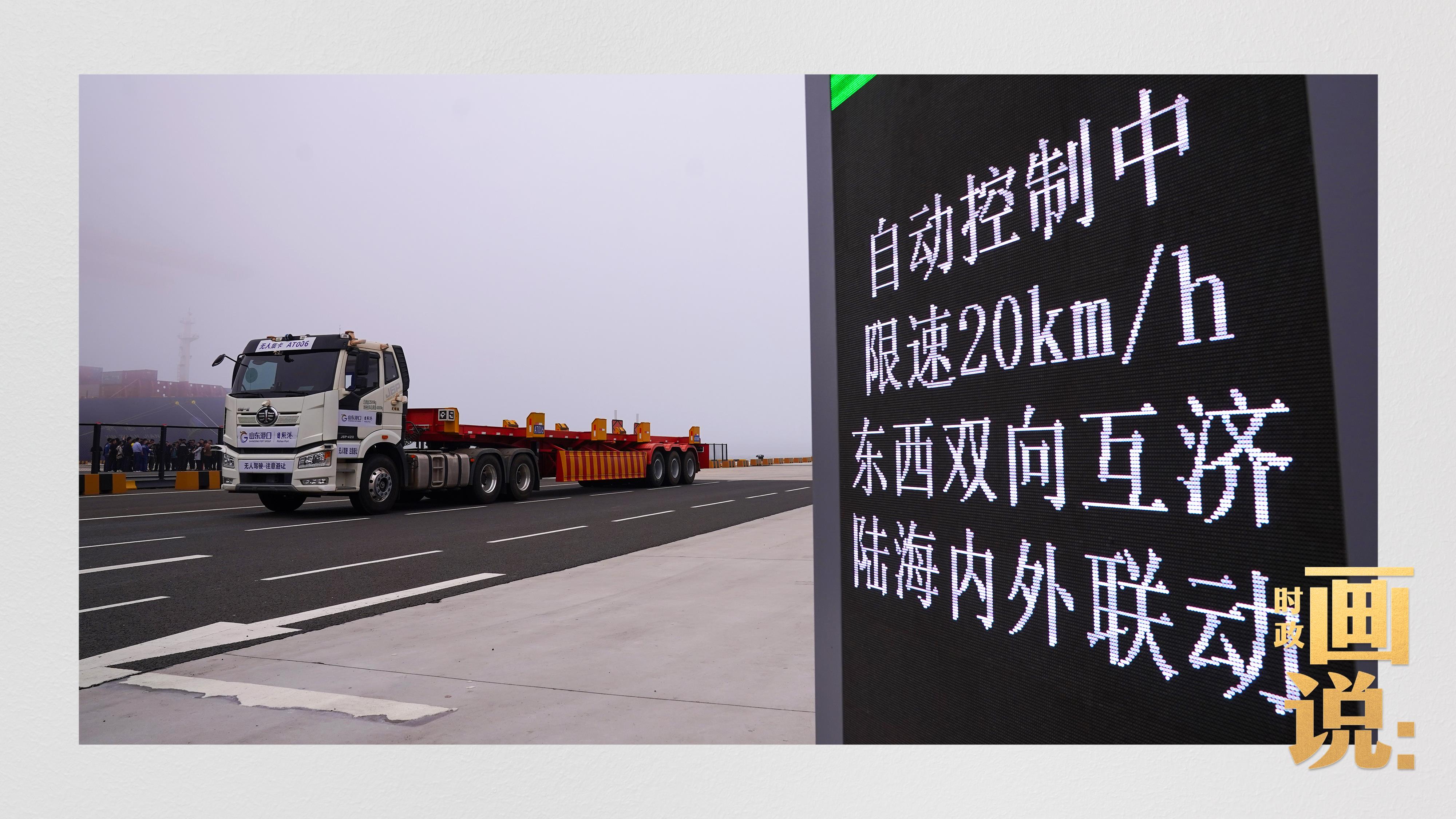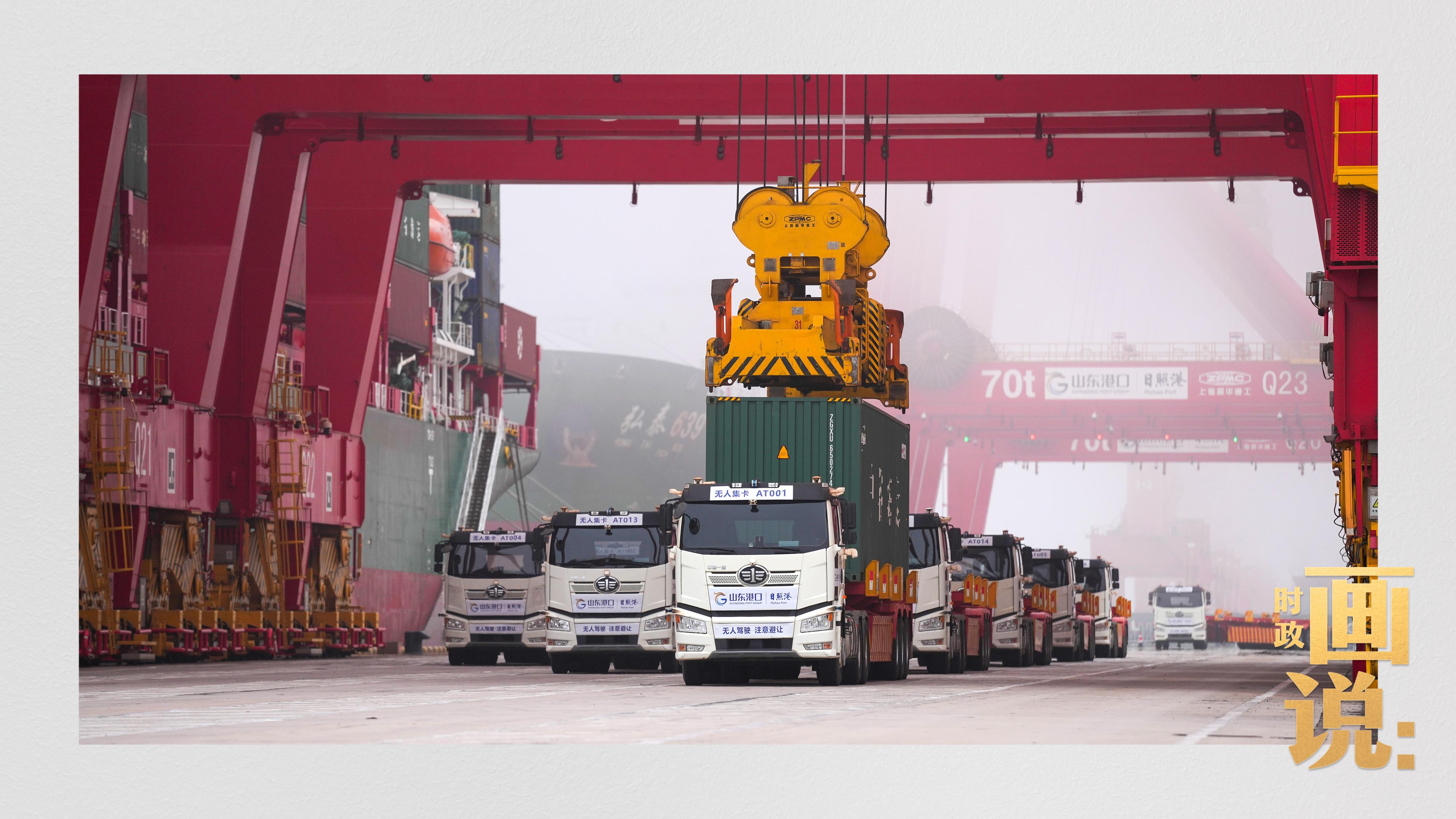 山東港口集團日照港順岸開放式全自動化集裝箱碼頭,無人集卡車在運送集裝箱。