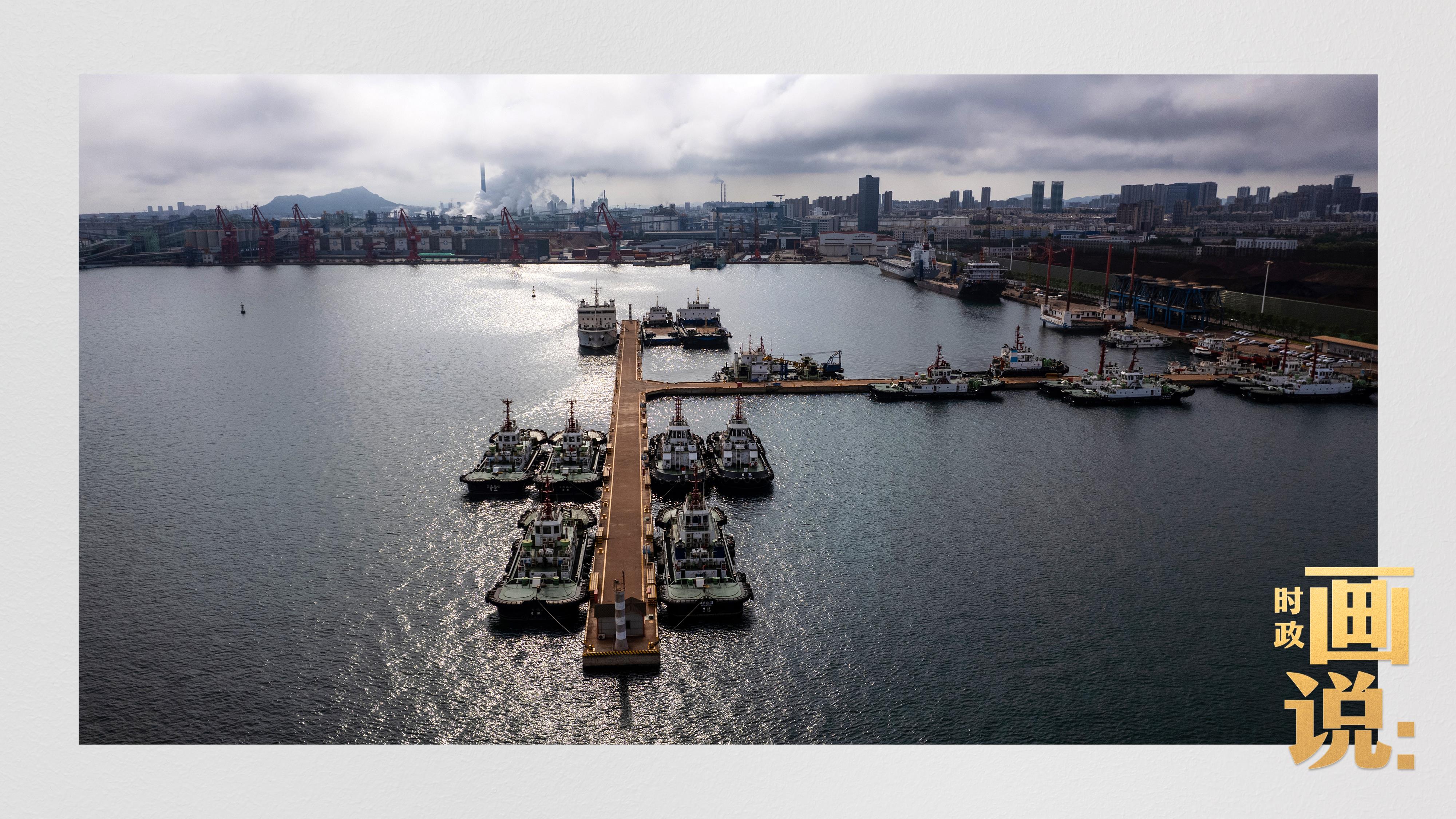 △陽光穿越云層,灑落在港區內待命的拖船碼頭。