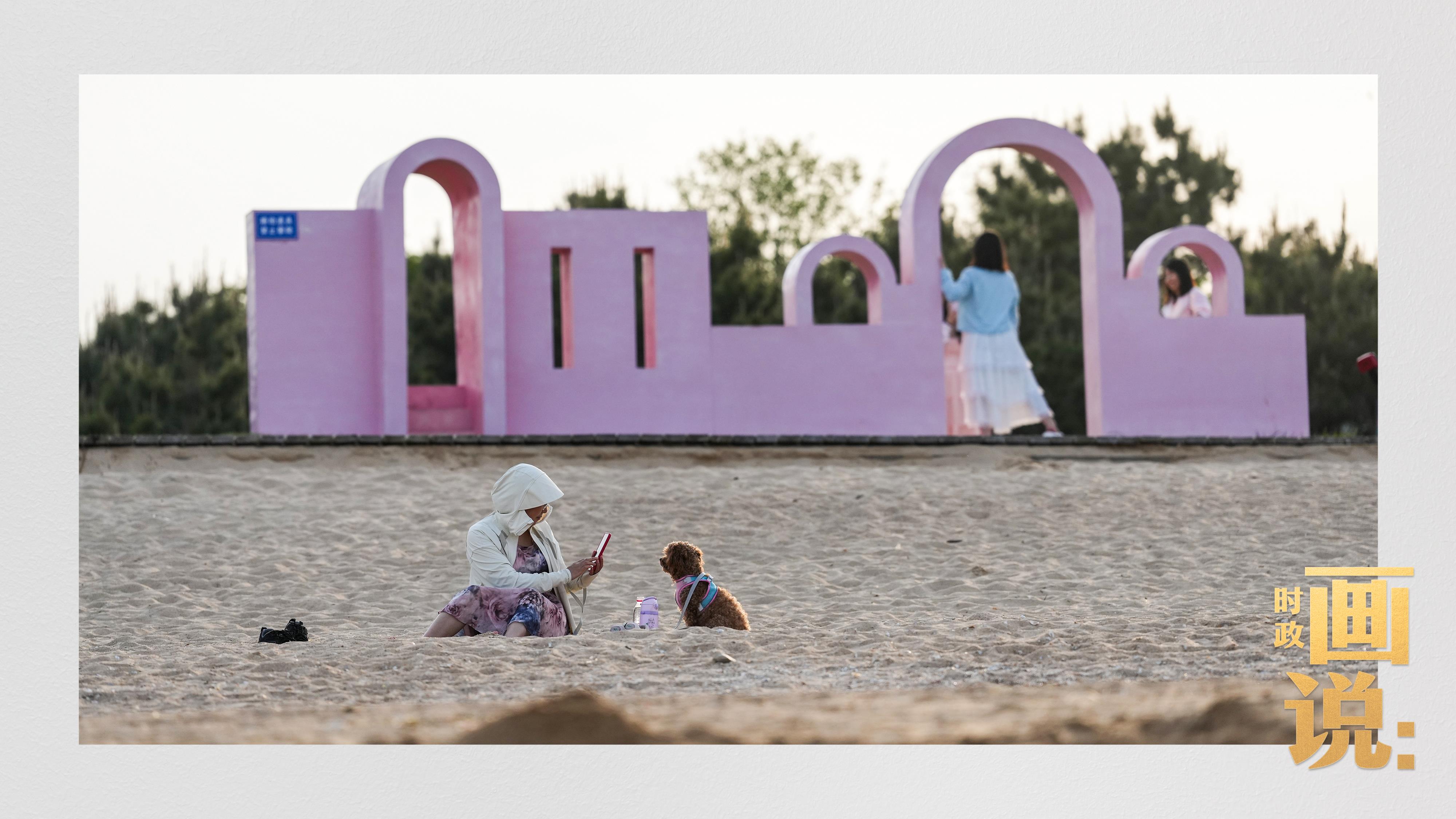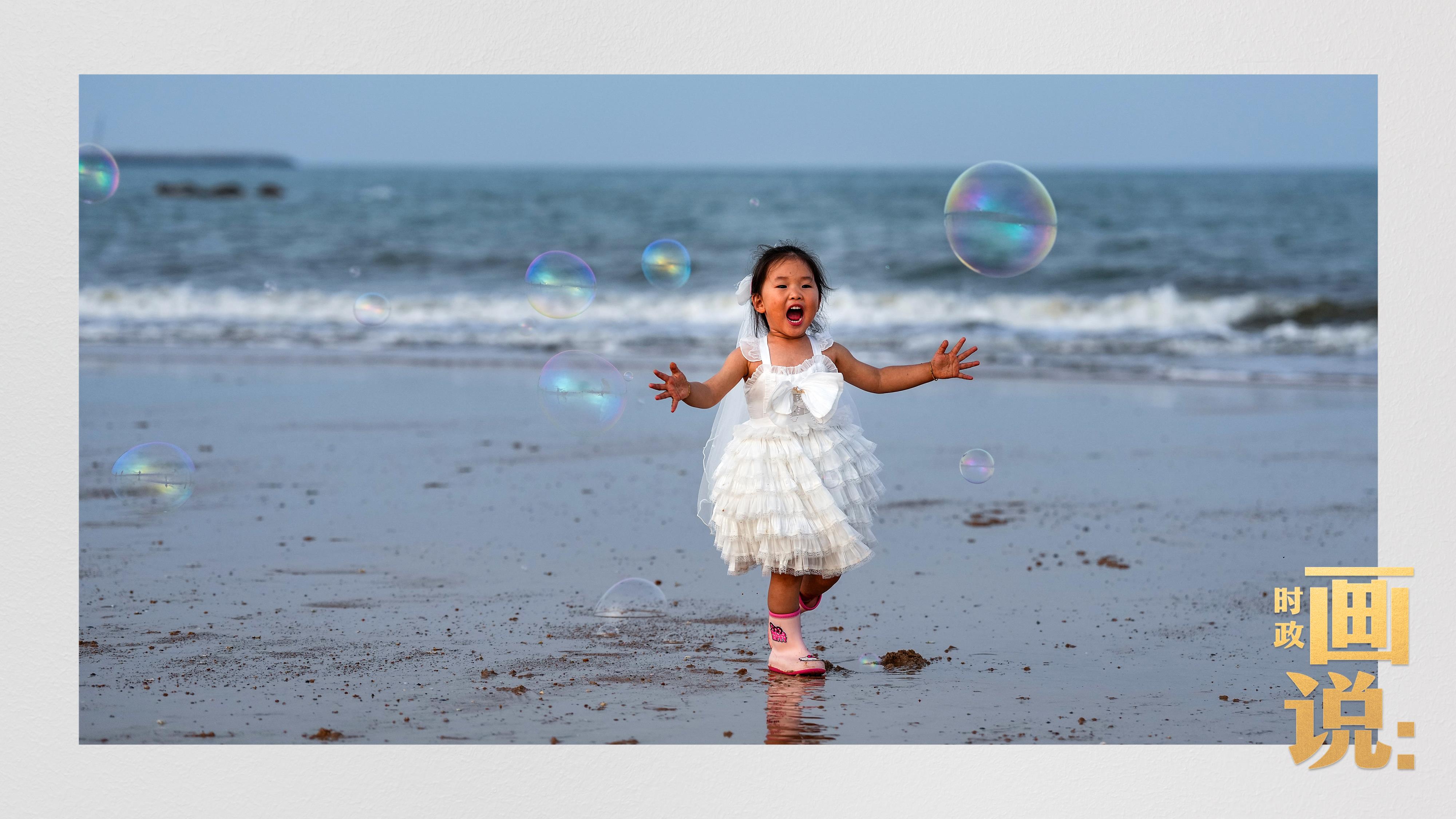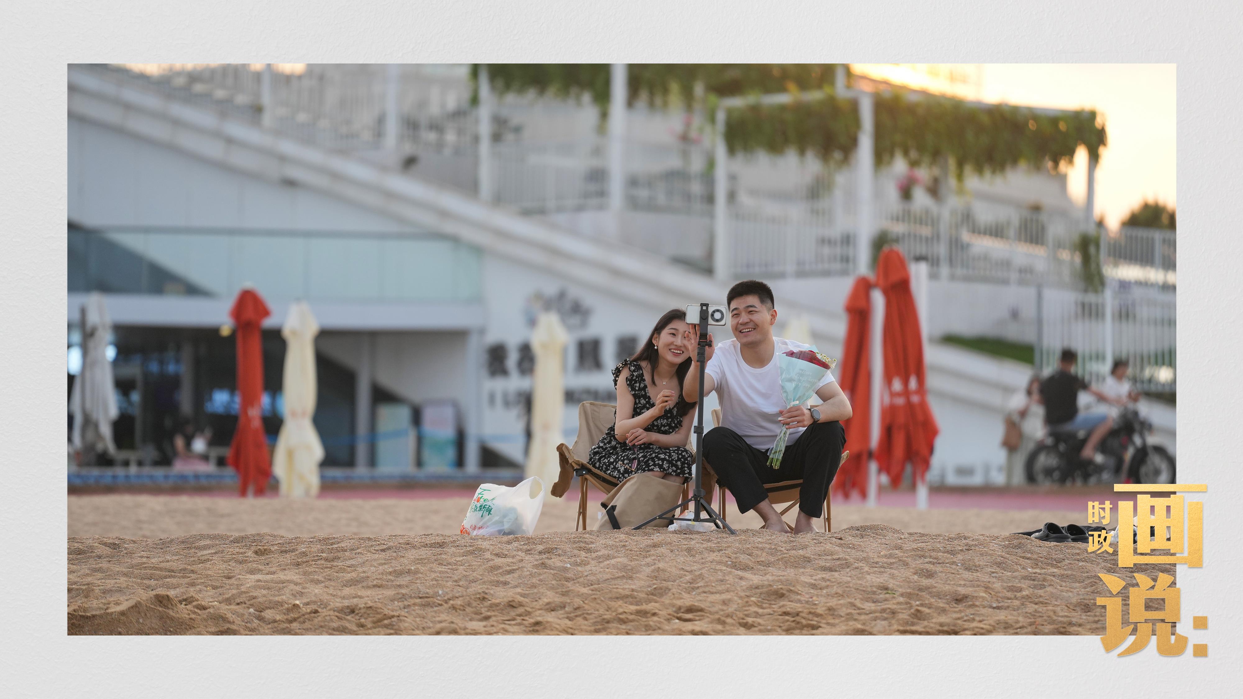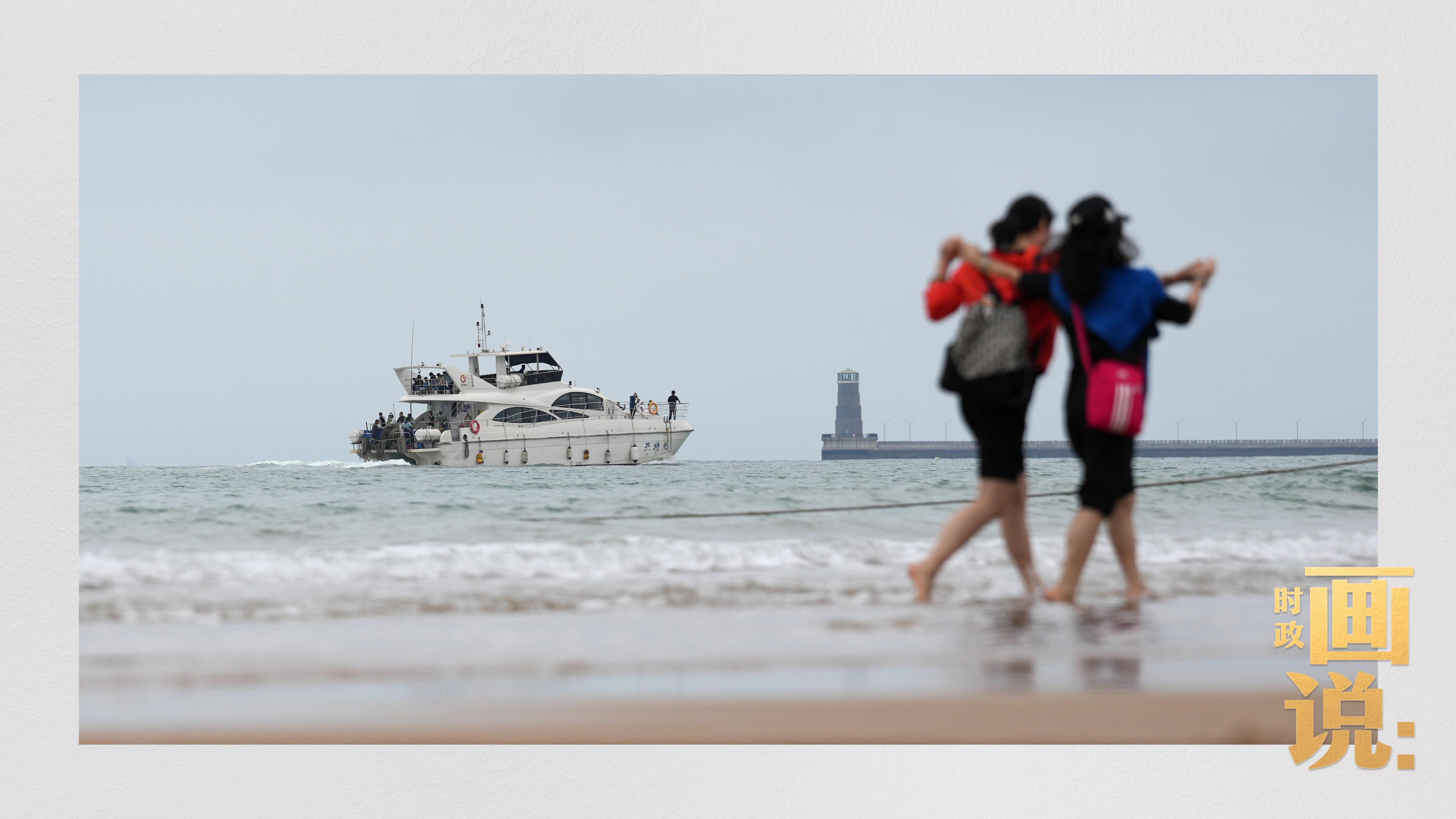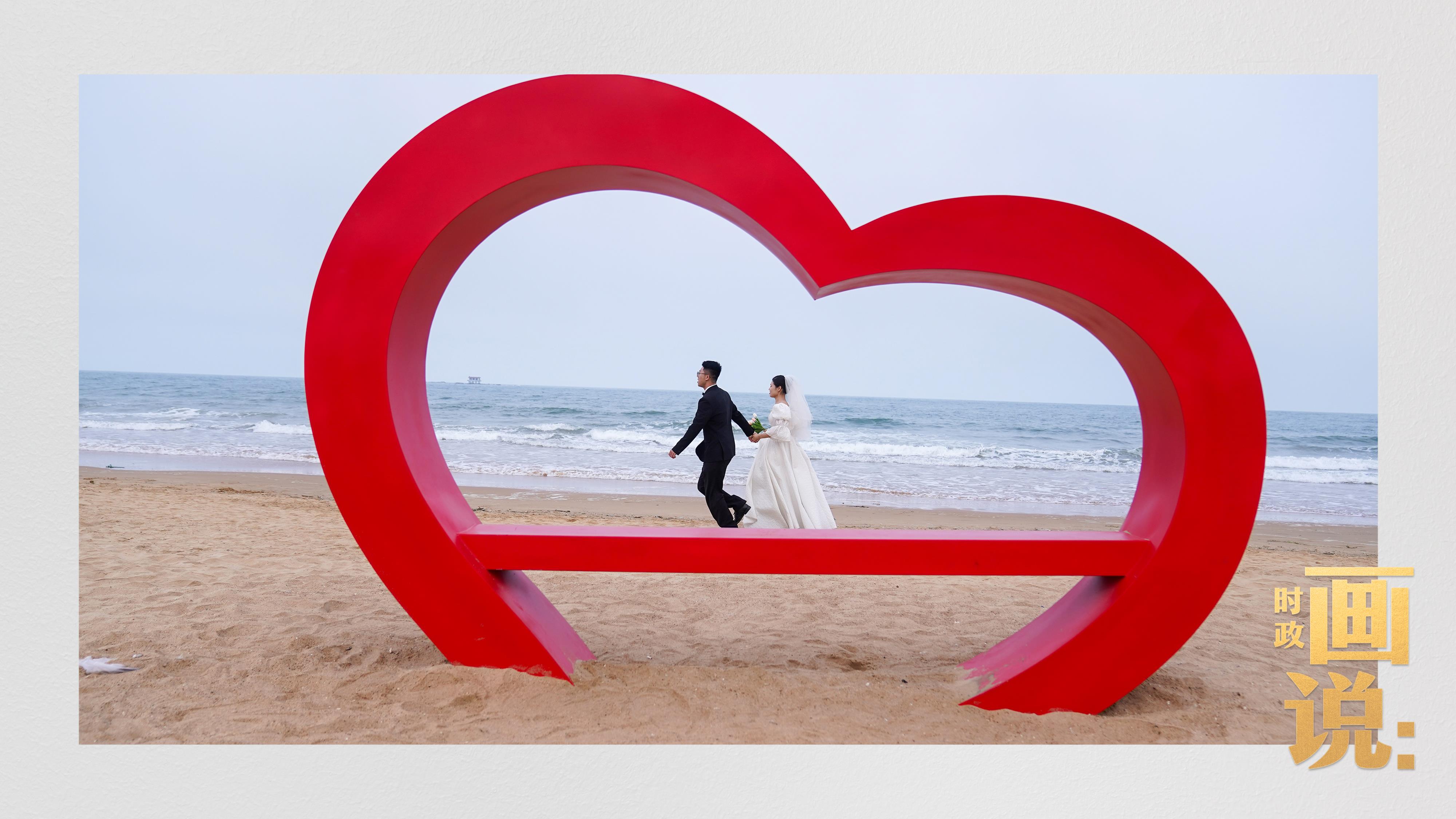 △日照陽光海岸綠道上的萬平口景區,一對游客在海浪中翩然起舞。