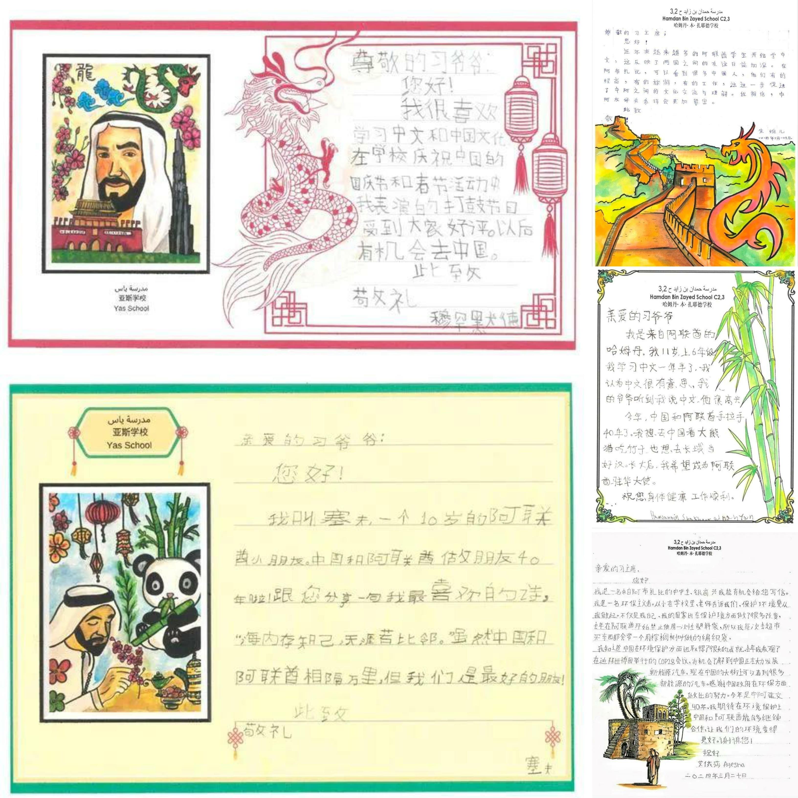 “我讀了你們每個人的信,從字里行間、畫里畫外感受到了大家對中國文化的熱愛,對兩國友好的期盼。”近日,習近平主席在給他們的復信中說,“5年前,我同穆罕默德總統共同啟動阿聯酋中文教學‘百校項目’,如今看到‘學中文’在阿聯酋已經成為一種新風尚,培養了一批像你們這樣的中阿交流小使者,我很欣慰。”
