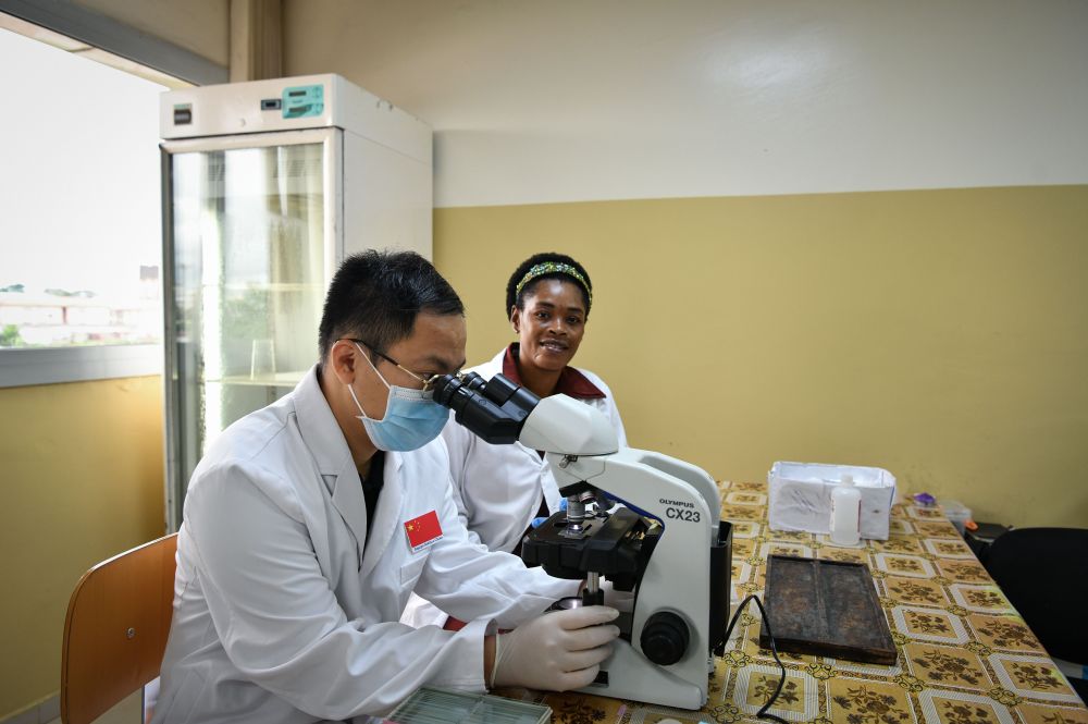 5月16日,在赤道幾內亞馬拉博地區(qū)醫(yī)院,中國醫(yī)生同當?shù)赝乱黄饳z測樣本。