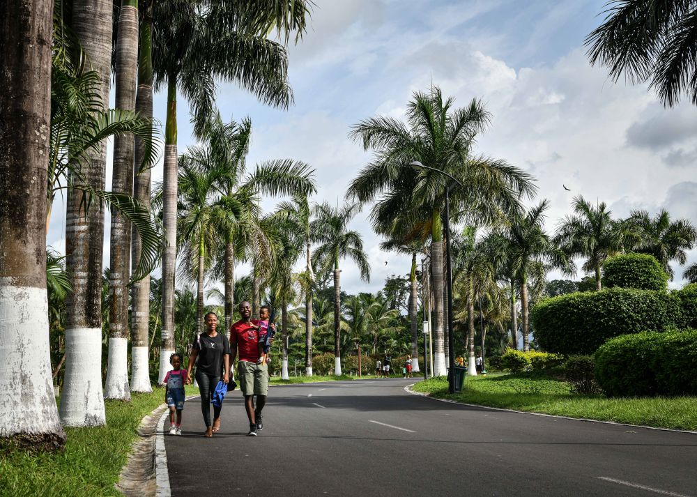 5月19日,在赤道幾內亞首都馬拉博,當?shù)鼐用裨谥袊髽I(yè)承建的馬拉博國家公園里散步。