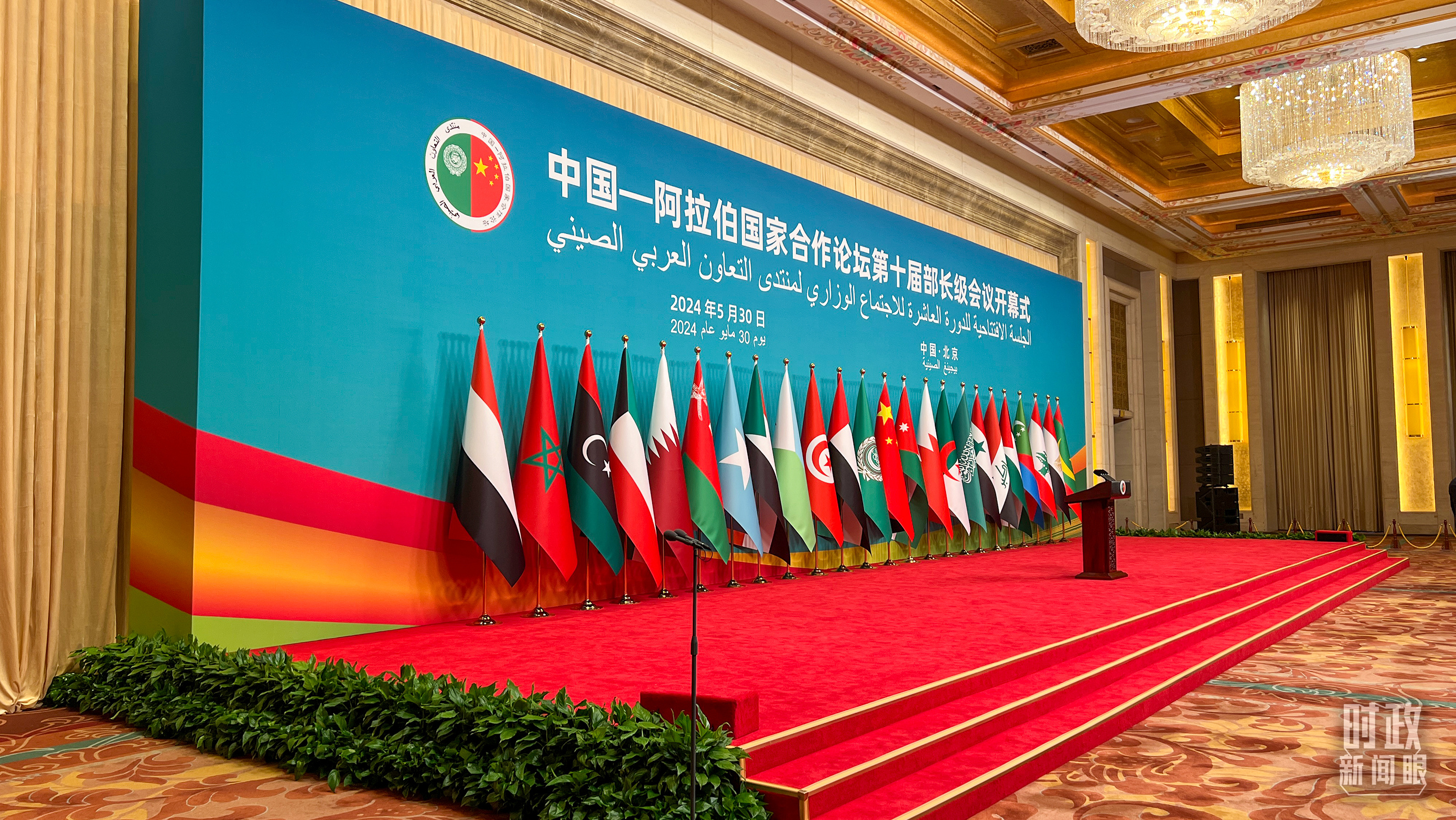 5月30日上午,北京釣魚臺芳華苑內,中國和22個阿拉伯國家國旗以及阿盟旗幟相映成輝。中阿合作論壇第十屆部長級會議開幕式在這里舉行。