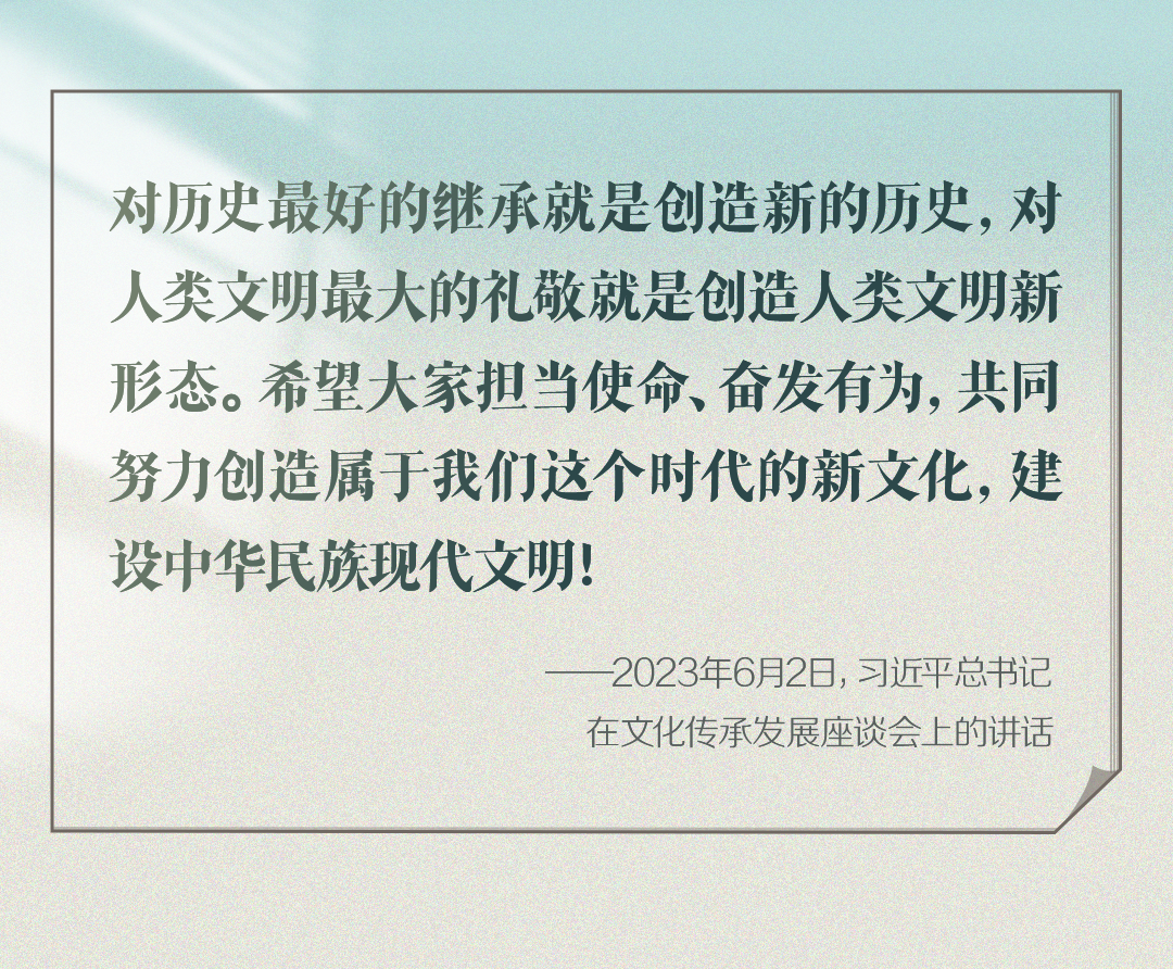 2023年6月2日,習近平總書記在文化傳承發展座談會上強調:“在新的起點上繼續推動文化繁榮、建設文化強國、建設中華民族現代文明,是我們在新時代新的文化使命。”