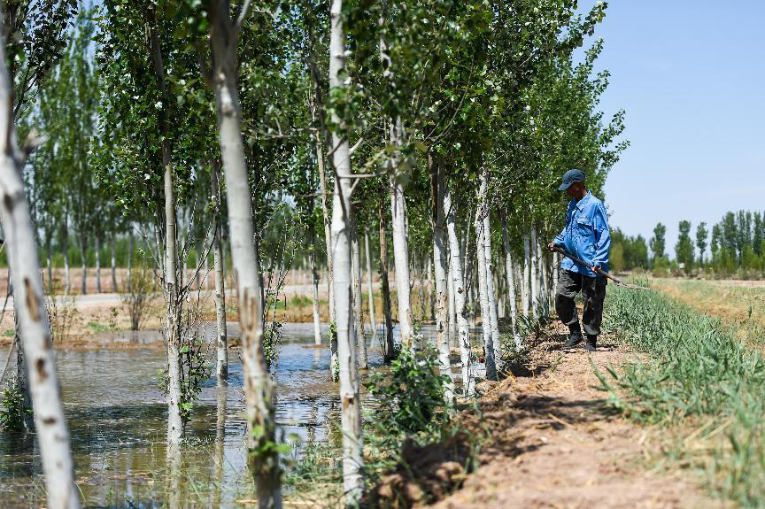 工人在內(nèi)蒙古巴彥淖爾臨河區(qū)國(guó)營(yíng)新華林場(chǎng)管護(hù)樹(shù)木(2024年5月26日攝)。數(shù)十年來(lái),林場(chǎng)結(jié)合“三北”防護(hù)林、京津風(fēng)沙源治理、低質(zhì)低效林改造等生態(tài)工程,持續(xù)提高森林覆蓋率。