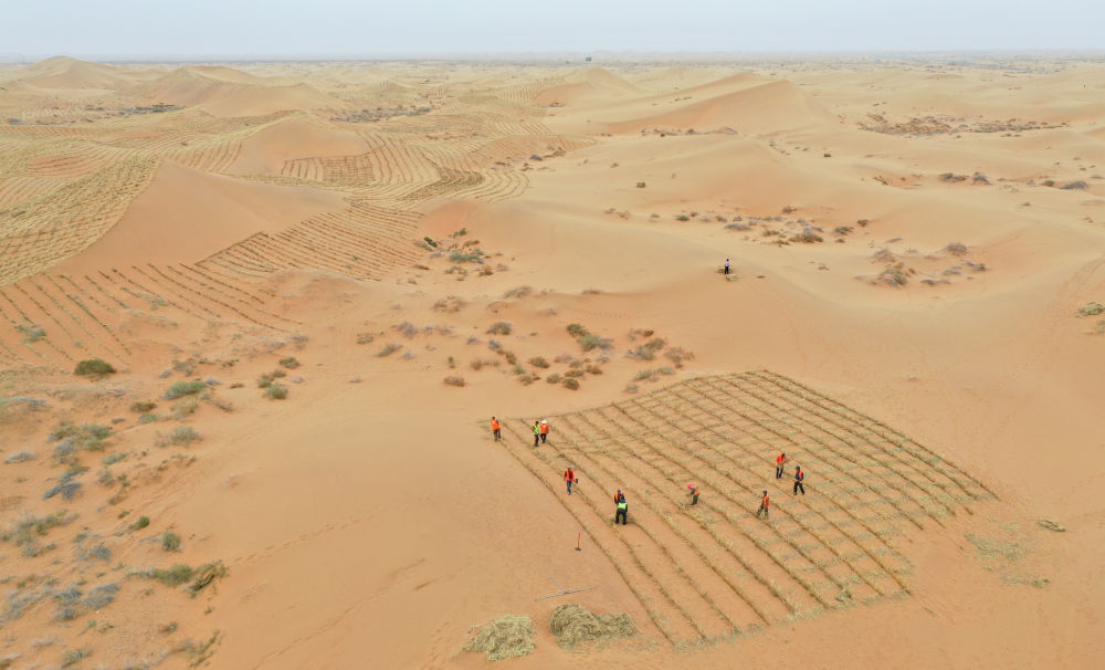 2024年4月27日,治沙工人在內(nèi)蒙古阿拉善左旗騰格里沙漠S315沿線固沙工程現(xiàn)場(chǎng)用稻草扎草方格(無(wú)人機(jī)照片)。