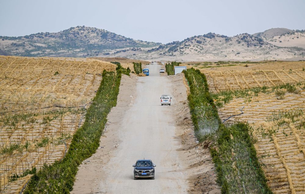 在內(nèi)蒙古赤峰市翁牛特旗巴彥呼交嘎查其白線防沙治沙項(xiàng)目區(qū),穿沙公路將沙地切割,沙丘被逐步固定(2024年5月16日攝,無(wú)人機(jī)照片)。