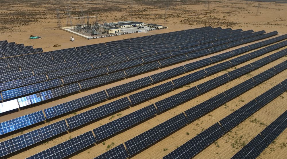 2024年5月16日在內(nèi)蒙古巴彥淖爾市磴口縣拍攝的烏蘭布和沙漠光伏基地(無(wú)人機(jī)照片)。烏蘭布和沙漠建設(shè)生態(tài)光伏基地,采取板上發(fā)電、板下種植的辦法,努力把沙海變?yōu)椤熬G海”。