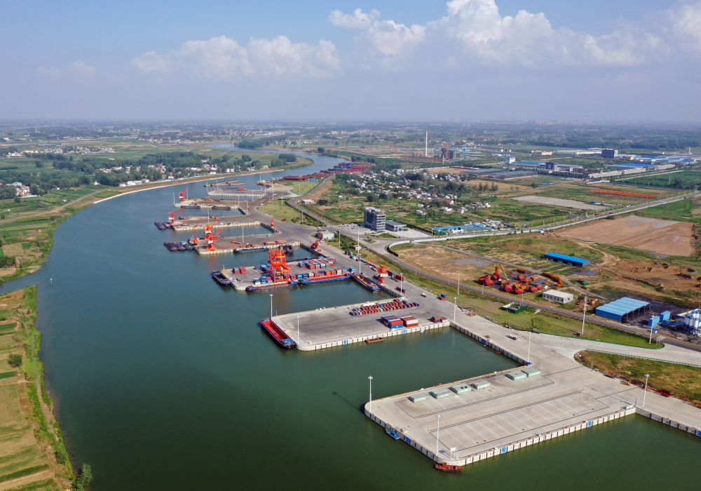 2022年6月28日拍攝的河南周口中心港碼頭(無人機照片)。近年來,河南積極推進沙潁河航道升級改造,疏通內河航運。現在,從周口中心港出發的船舶可經沙潁河至淮河、京杭大運河駛入長江,讓內陸城市亦能通江達海。
