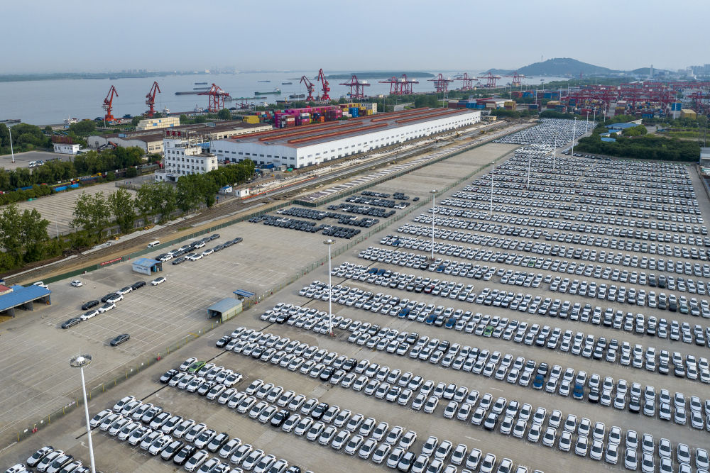 2024年5月26日,在安徽蕪湖港朱家橋港區國際集裝箱碼頭,整齊排列的汽車等待出口(無人機照片)。作為安徽省首個國家一類開放口岸,蕪湖港現已發展成為長三角城市群綜合交通運輸體系的重要樞紐。