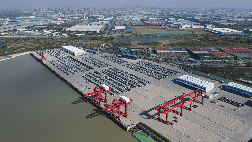 這是2022年10月11日拍攝的安徽合肥派河國際綜合物流園港區碼頭(無人機照片)。依托連通長江與淮河的江淮運河,2023年7月,占地6000多畝的合肥生產服務型國家物流樞紐獲批。以派河港為圓心,半徑5公里范圍內布局了3個整車基地;半徑10公里范圍內,覆蓋了合肥七成的先進制造業企業,工業總產值超7000億元。