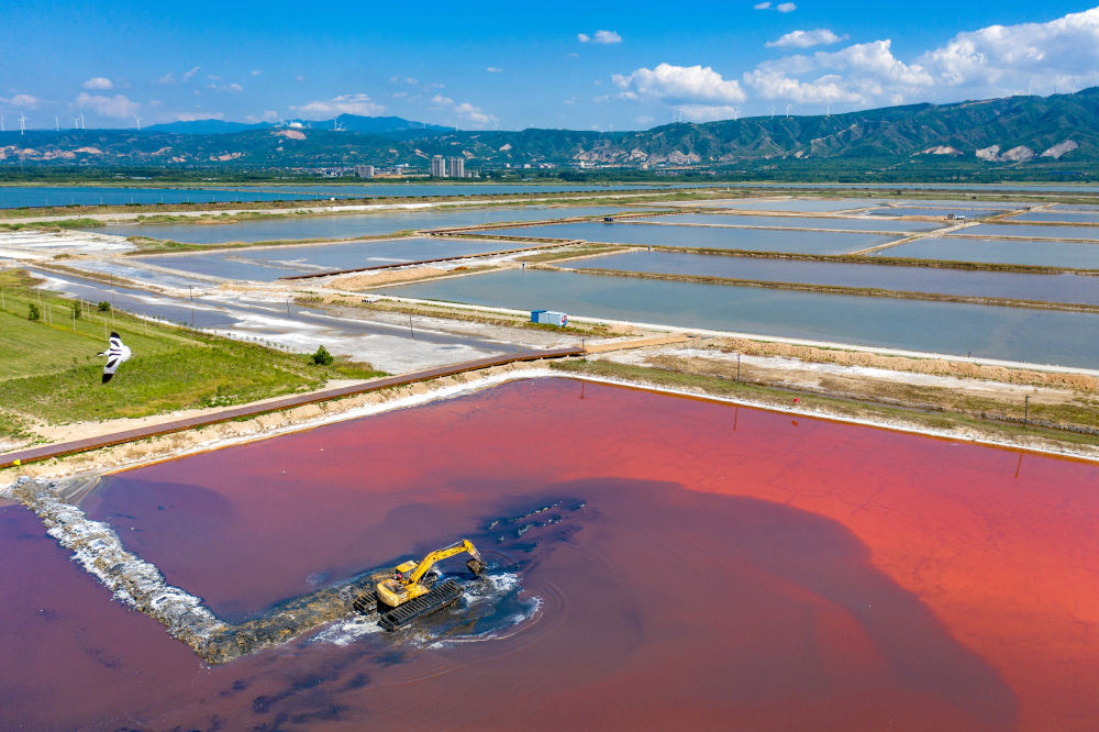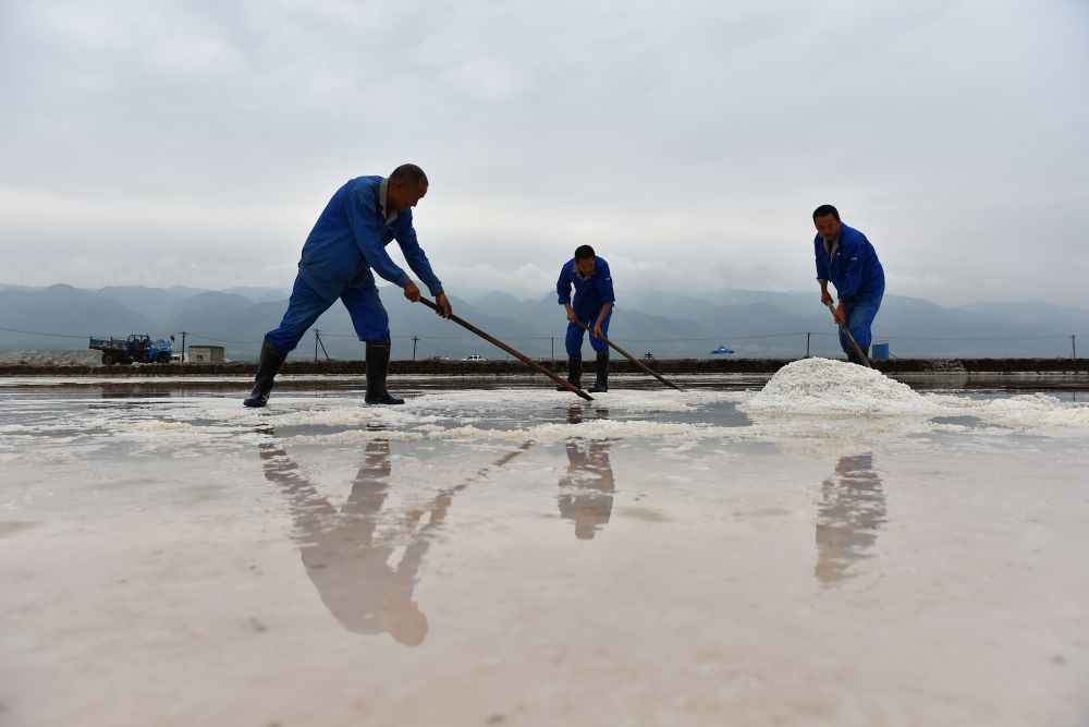 2016年8月25日,工人在運城鹽湖進行扒鹽作業。