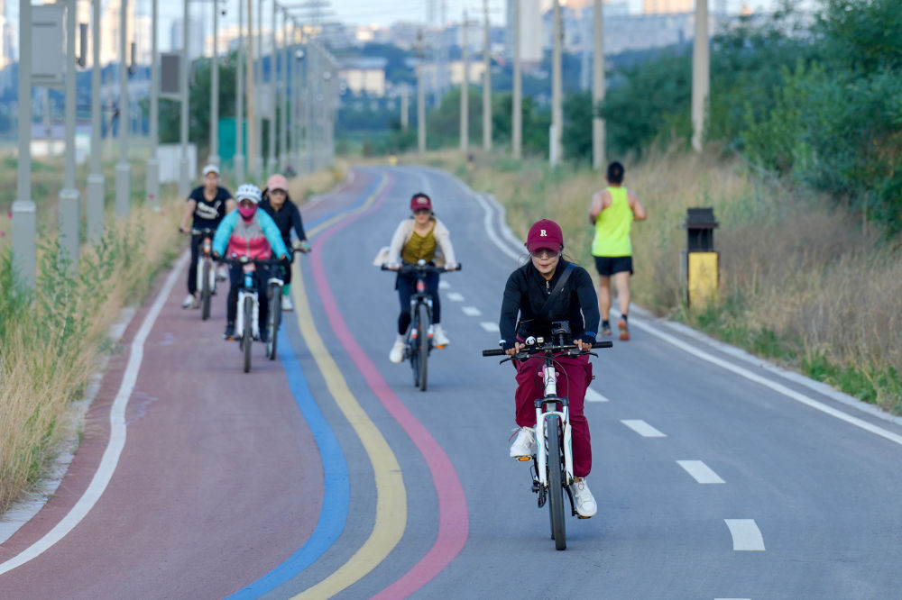 2024年6月5日,人們在運城鹽湖環湖步道上騎行。