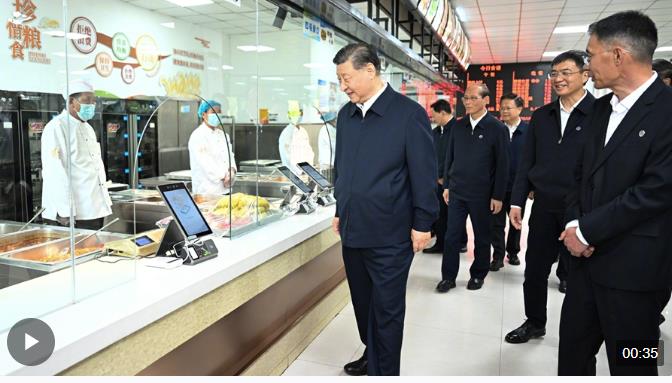 18日下午,習近平總書記來到果洛西寧民族中學,走進食堂察看學生就餐條件,囑咐食堂工作人員一定要確保學生飲食安全、營養可口。