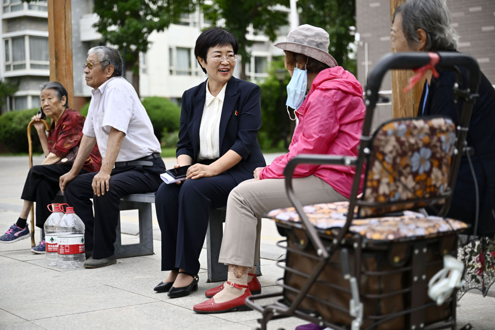 6月20日,寧夏銀川市金鳳區長城花園社區黨委書記趙耐香(左三)在社區廣場與居民交流。