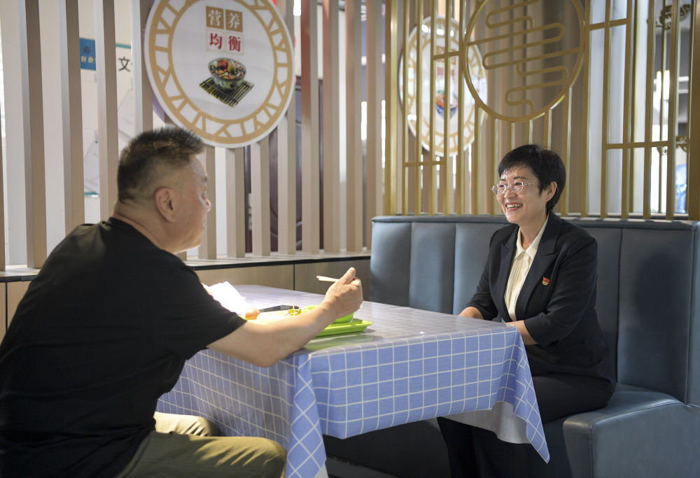 6月20日,寧夏銀川市金鳳區長城花園社區黨委書記趙耐香在社區日間照料中心了解食堂運行情況。