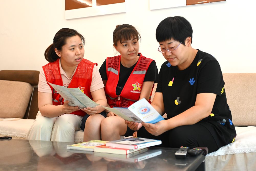 6月20日,寧夏銀川市金鳳區長城花園社區志愿者在入戶為居民提供服務。