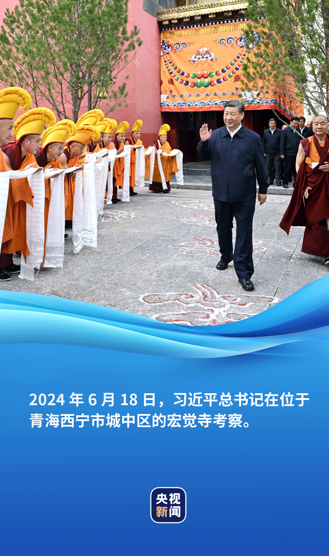 6月18日,正在青海考察的習近平總書記來到位于西寧市城中區的宏覺寺。在寺前院落,宏覺寺民主管理委員會負責人向總書記敬獻哈達,僧人提香爐、持寶傘迎接總書記。