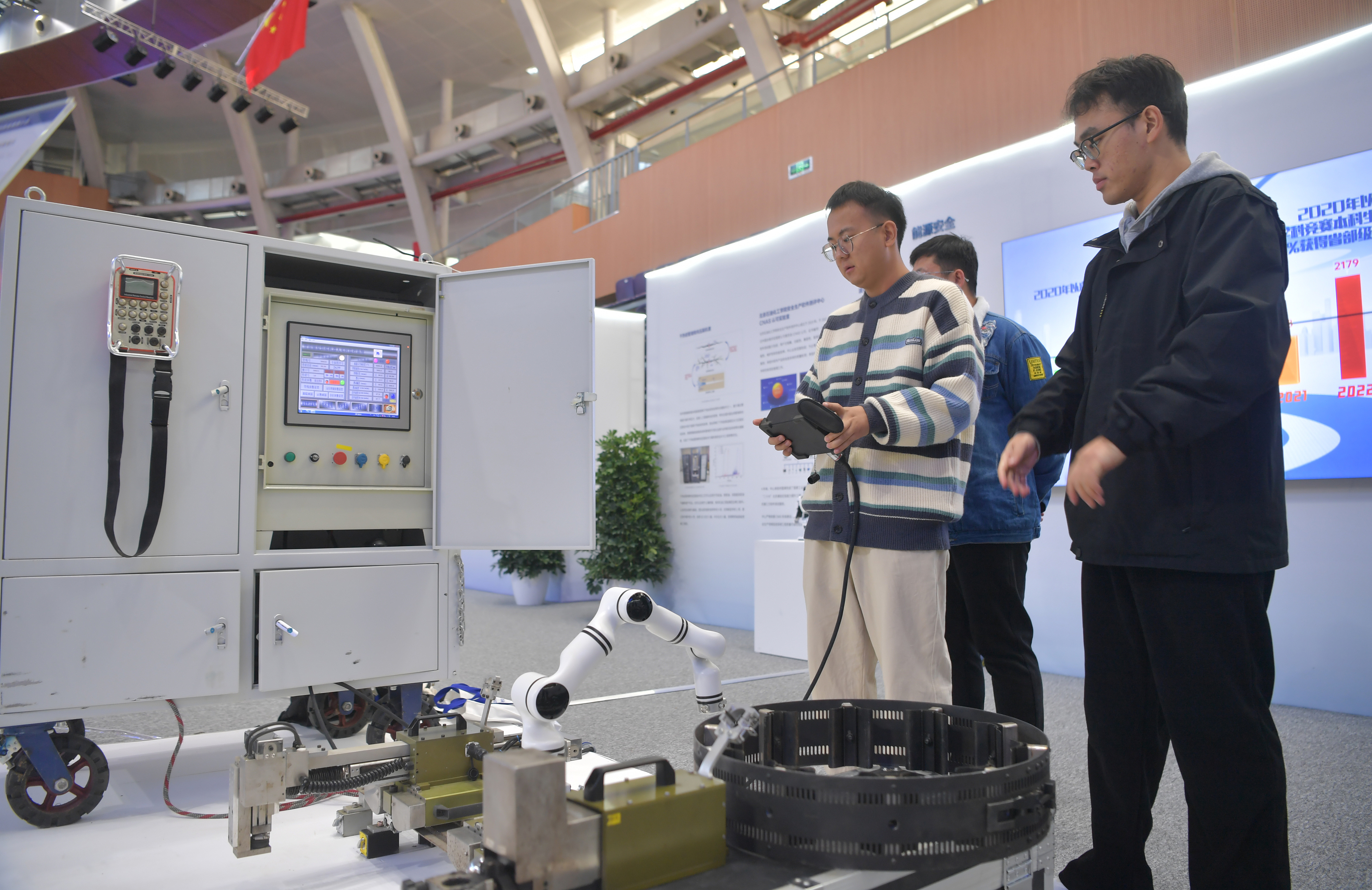 2023年,京南地區高校科技成果推介會在北京建筑大學大興校區舉行。圖為高校師生在展示管道全位置焊接機器人系統成果。