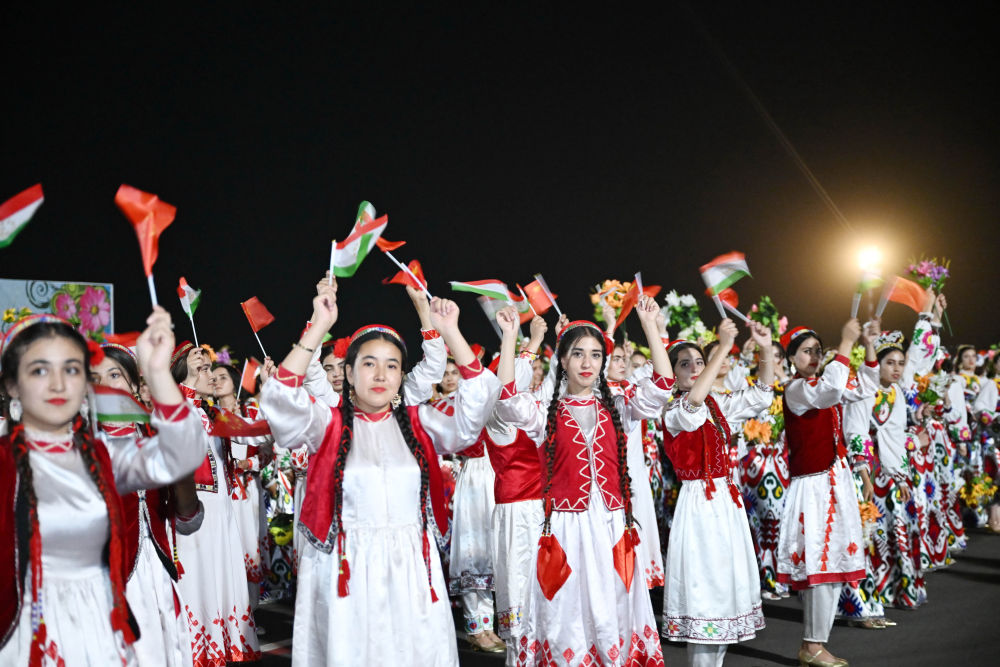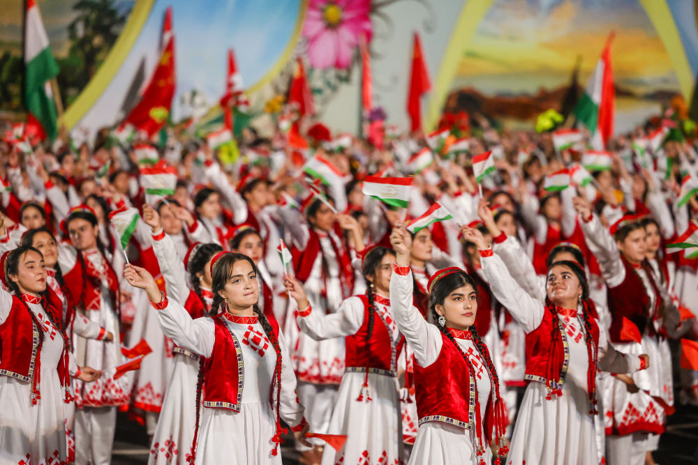 拉赫蒙在機場為習近平舉行盛大隆重的迎賓儀式。1500多名身著民族盛裝的塔吉克斯坦青年表演富有濃郁特色的中塔歌舞,揮舞中塔兩國國旗,表達對中國最尊貴客人的熱烈歡迎。