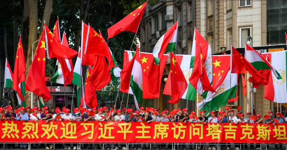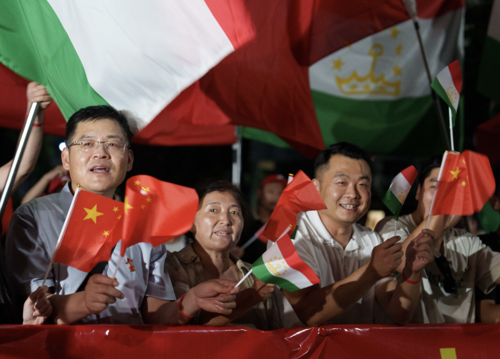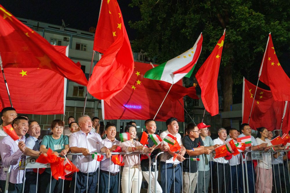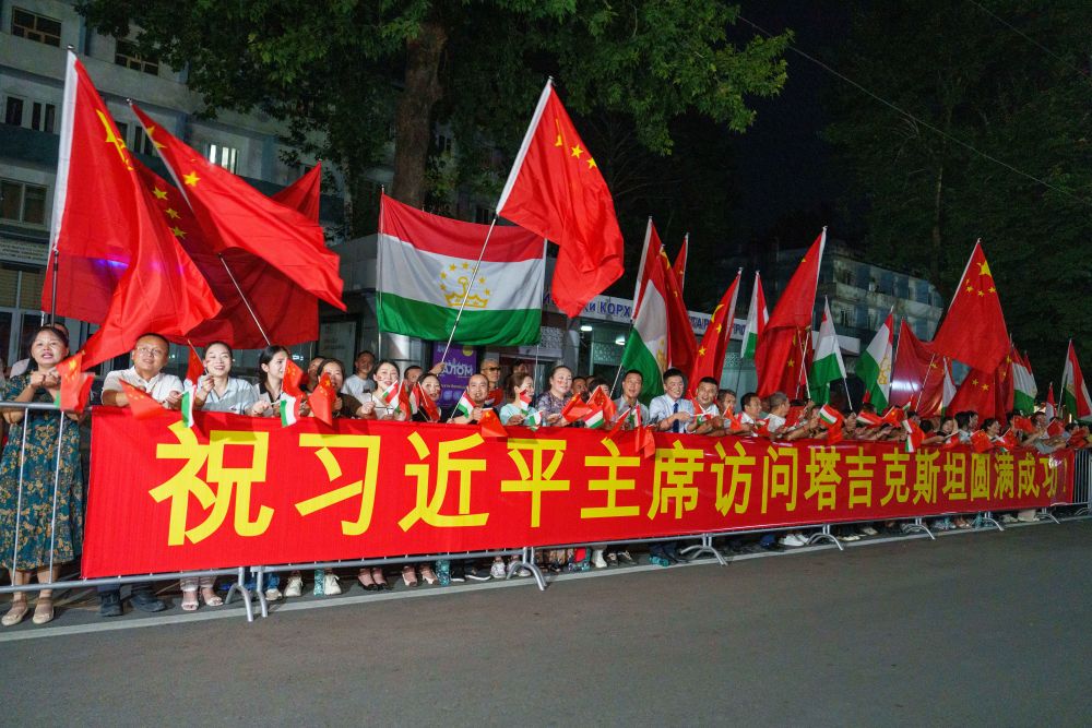 習近平乘車從機場赴下榻飯店途中,中塔兩國國旗迎風飄揚,當地華僑華人和中資機構代表列隊揮舞中塔兩國國旗,熱烈歡迎習近平訪問塔吉克斯坦。
