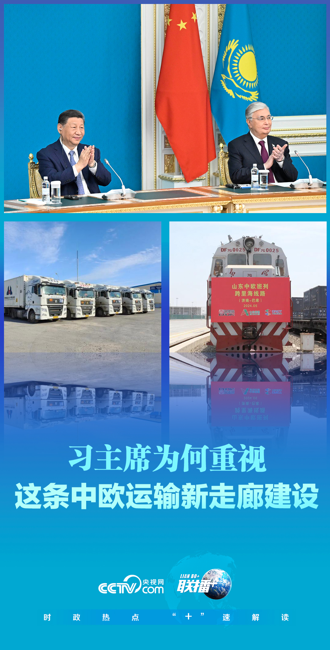 7月3日,正在哈薩克斯坦訪問的習近平主席同托卡耶夫總統以視頻方式共同出席中歐跨里海直達快運開通儀式。兩國元首共同下達作業指令。