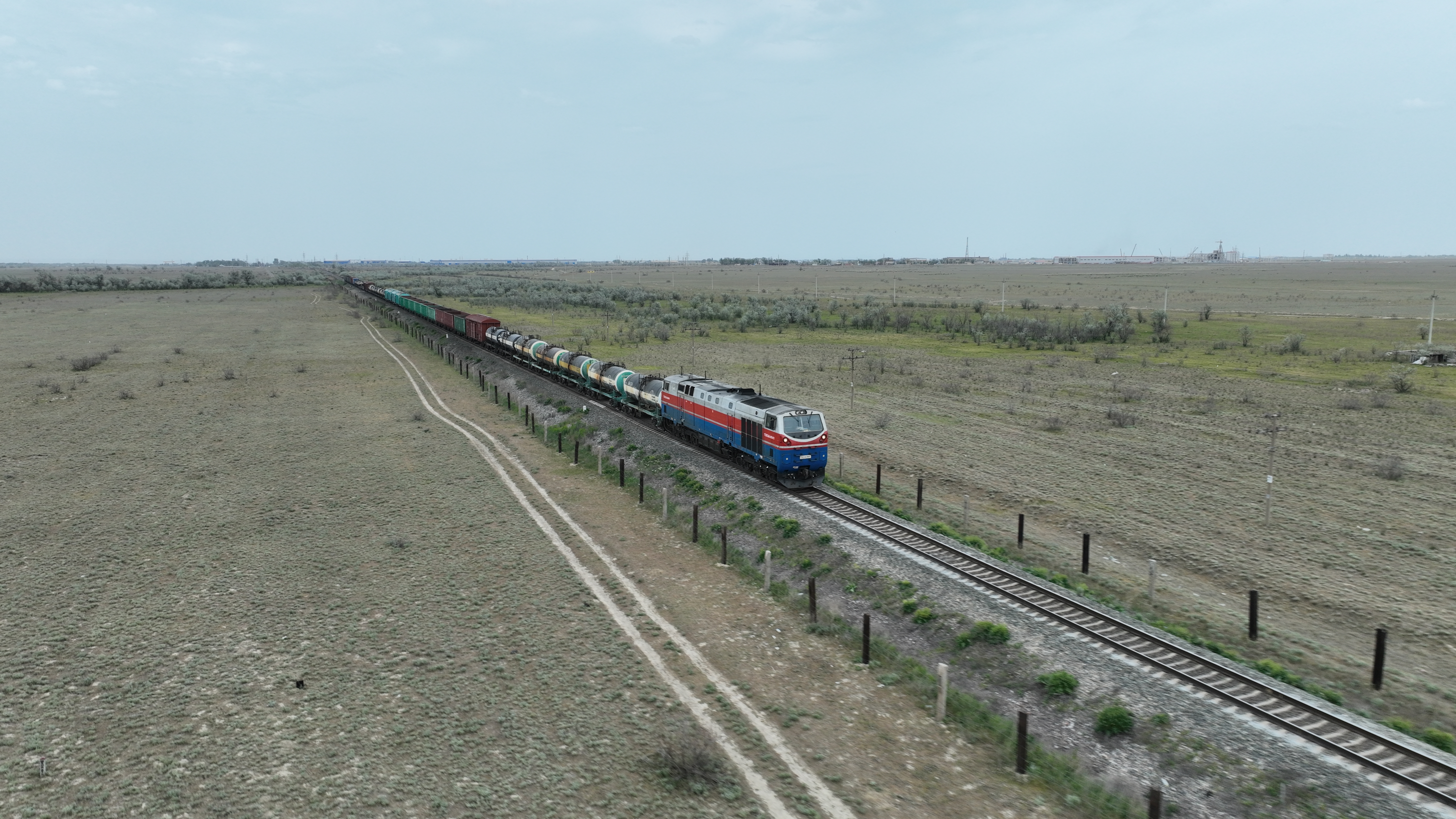 2023年5月12日,在哈薩克斯坦阿拉木圖附近,貨運列車馳騁于阿拉木圖與中國霍爾果斯間(無人機照片)。