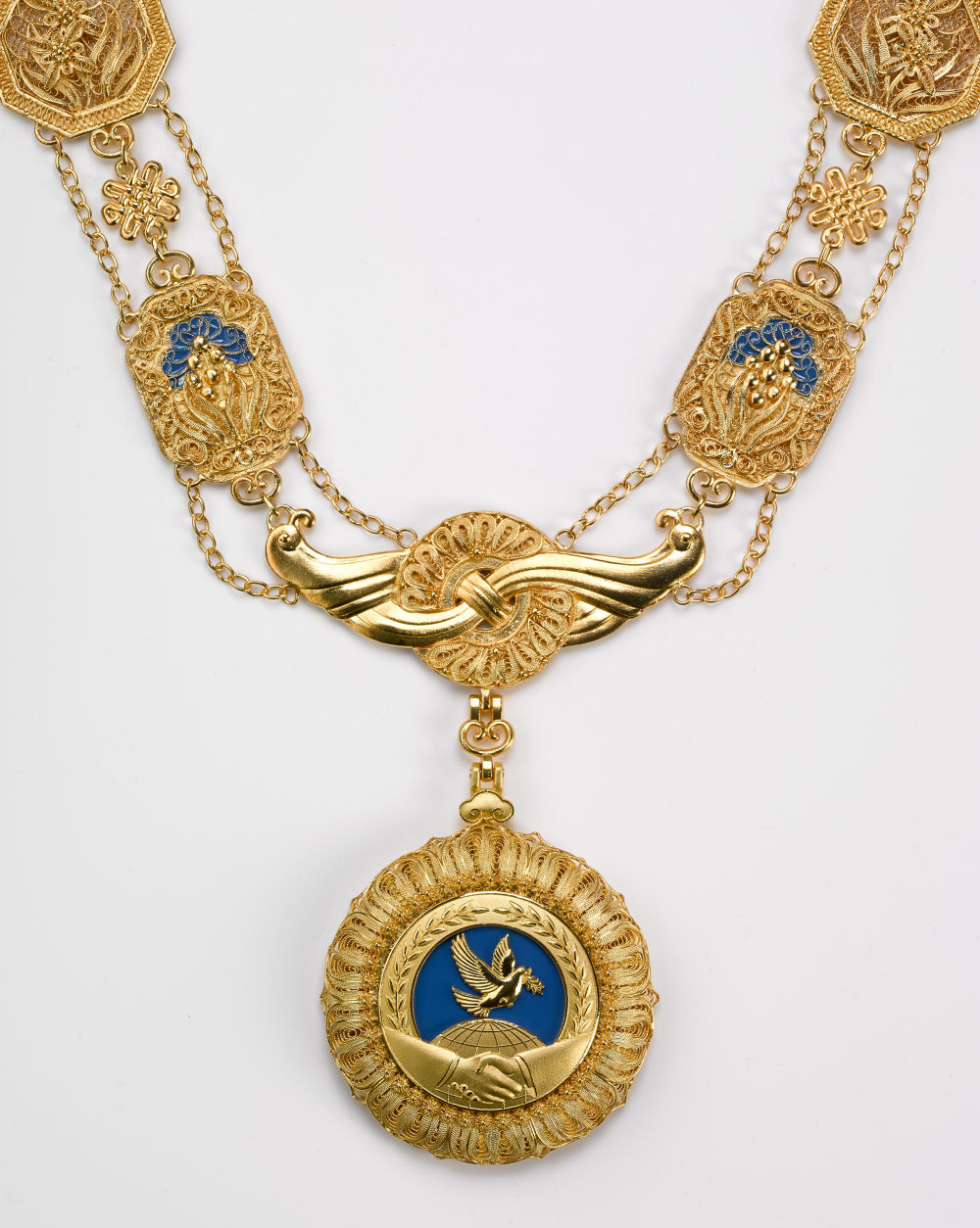 “友誼勛章”章體以金色、藍色為主色調,采用和平鴿、地球、握手、荷花等元素,章鏈采用中國結、萬年青、牡丹花、玉璧、蘭草等元素,整體采用花絲鑲嵌、掐絲琺瑯等傳統工藝手工制作。設計制作象征中國人民同各國人民友好團結、友誼長存,祝愿世界各國共同繁榮發展。