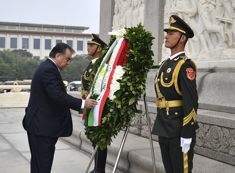 2017年8月31日,塔吉克斯坦總統拉赫蒙前往北京天安門廣場,向人民英雄紀念碑敬獻花圈。