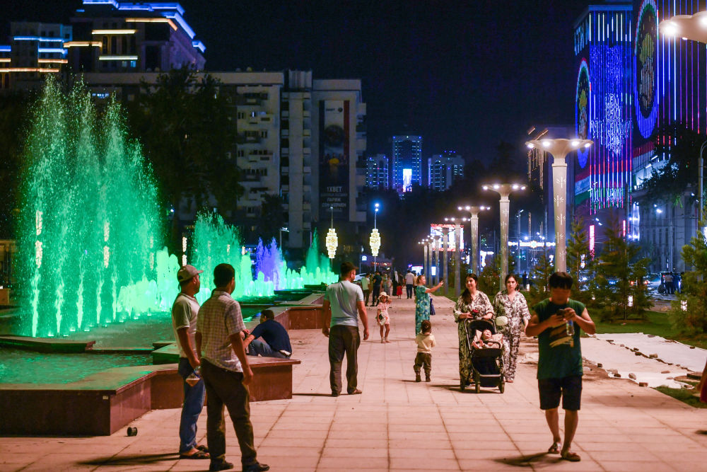 6月25日,在塔吉克斯坦首都杜尚別街頭,入夜后當地居民帶著孩子消暑納涼。