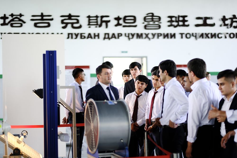 6月14日,在塔吉克斯坦首都杜尚別,學生們在魯班工坊內聽老師講解。