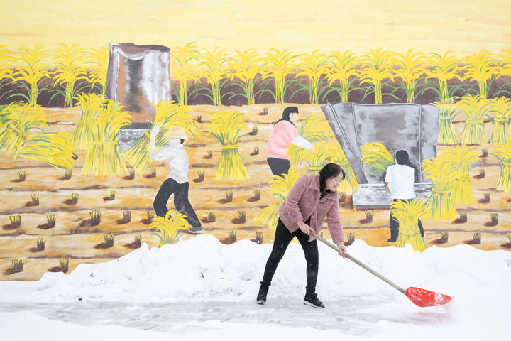 黑龍江省漠河市北極鎮北紅村“遠方故里”民宿負責人張翠花在清理積雪(2023年1月12日攝)。