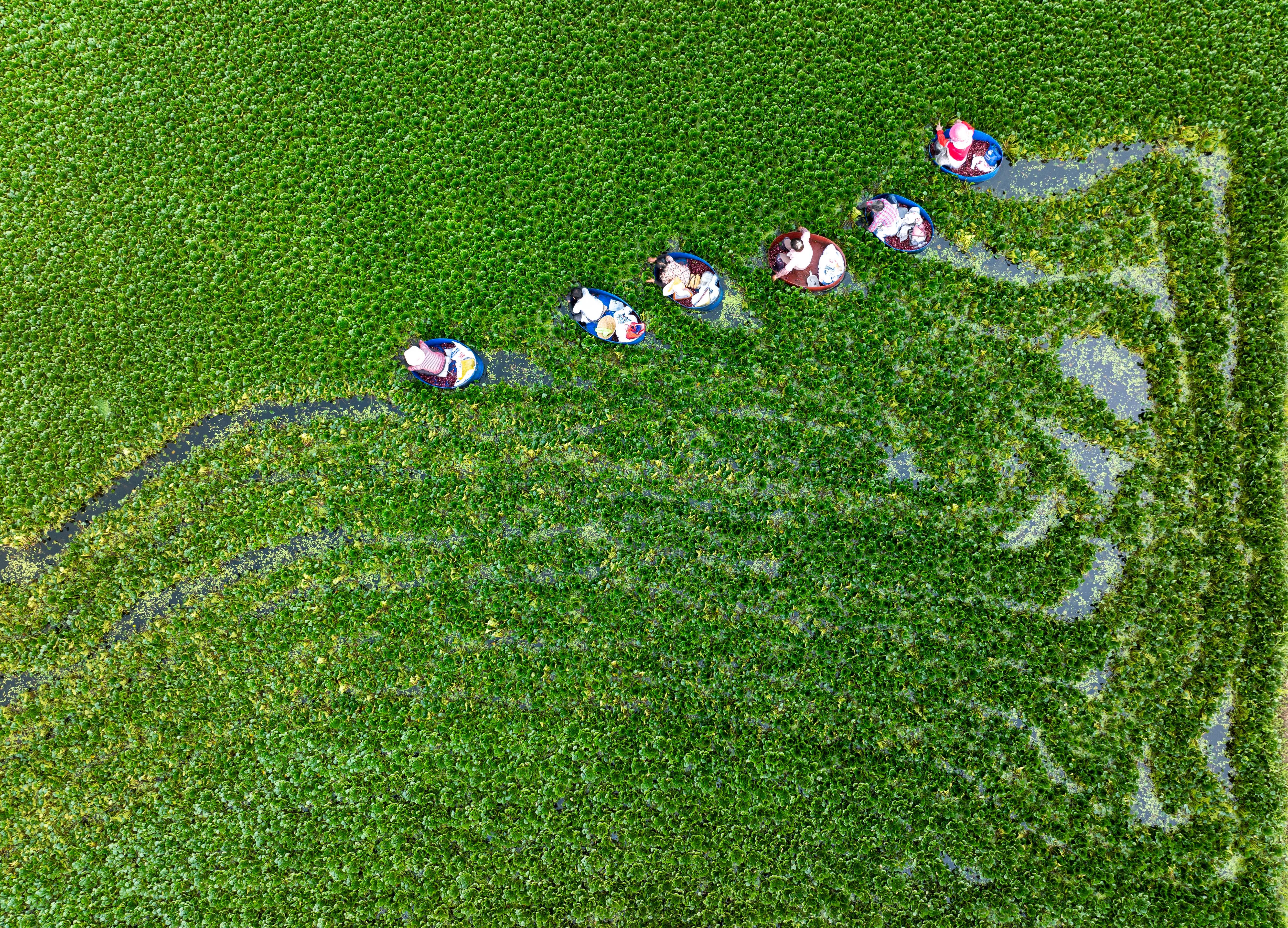2024年8月7日,江蘇淮安市洪澤區岔河鎮的村民采收菱角。近年來,當地利用白馬湖優質水域生態為依托,帶動當地農民增收致富,助力鄉村振興。