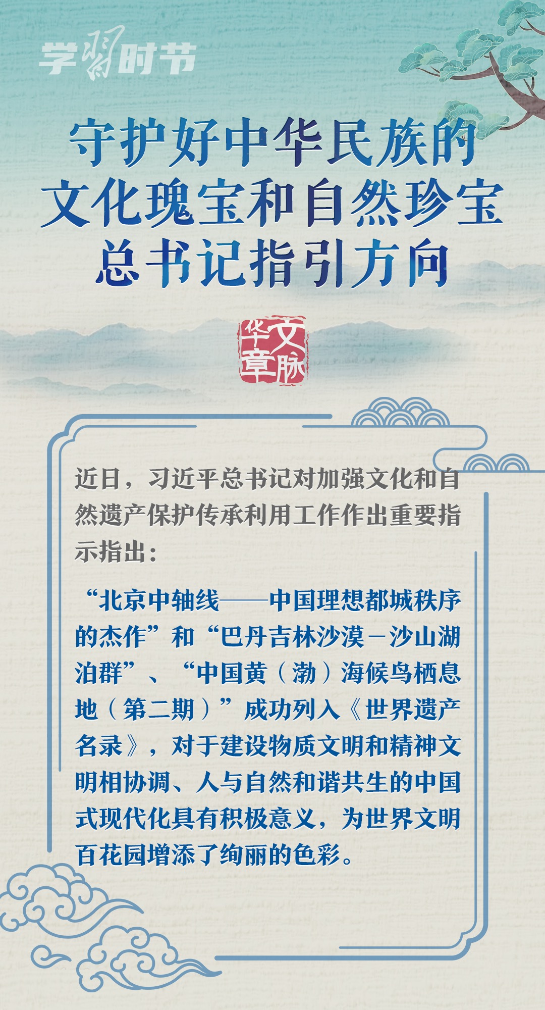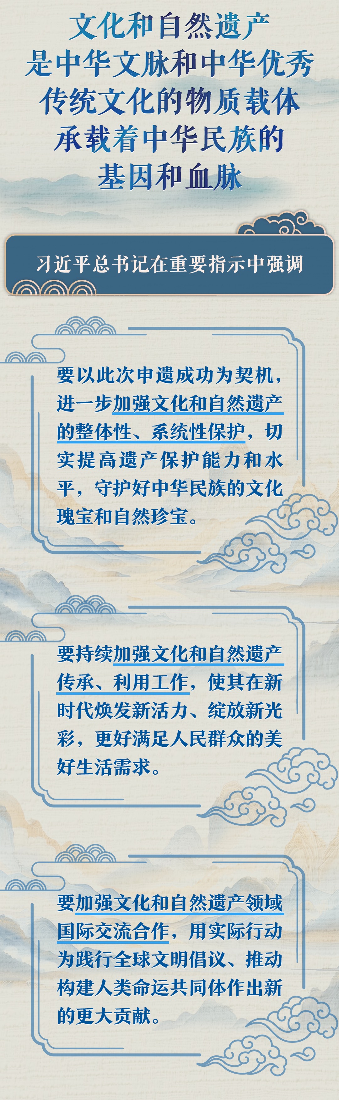 文化遺產體現了中華民族旺盛的生命力和創造力,自然遺產昭示了神奇的自然造化同中華民族的和諧依存關系。習近平總書記一直以來高度重視文化和自然遺產保護傳承利用工作,近日專門就此作出重要指示強調,守護好中華民族的文化瑰寶和自然珍寶,讓文化和自然遺產在新時代煥發新活力綻放新光彩。讓我們一同學習。