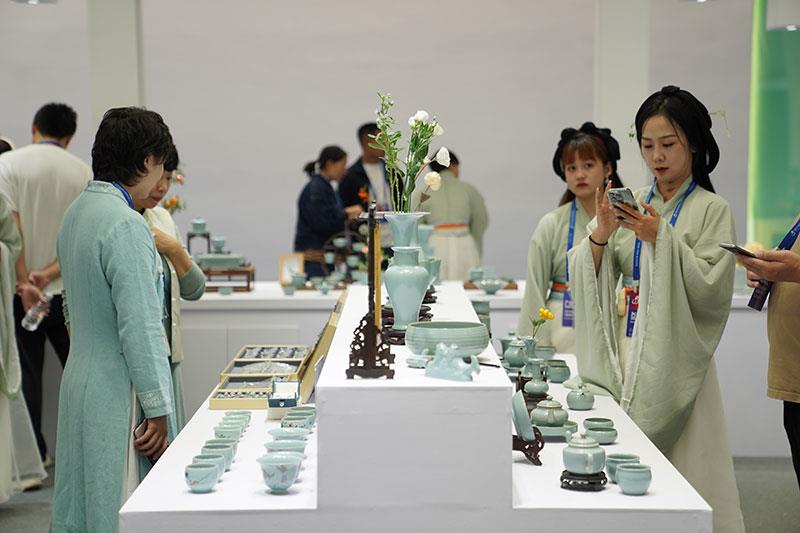 2023年10月18日,人們?cè)?023中國景德鎮(zhèn)國際陶瓷博覽會(huì)汝窯展臺(tái)參觀。