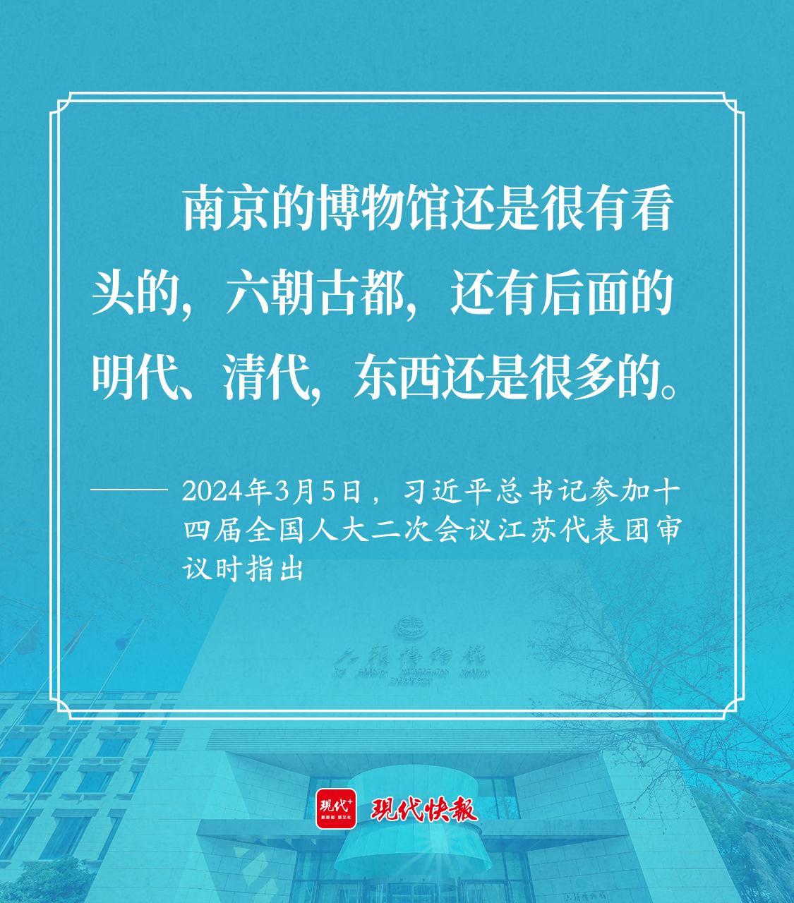 2024年3月5日,習(xí)近平總書記參加十四屆全國人大二次會議江蘇代表團(tuán)審議。總書記在聽完南京市博物總館副館長宋燕代表講述后表示,“南京的博物館還是很有看頭的,六朝古都,還有后面的明代、清代,東西還是很多的。”