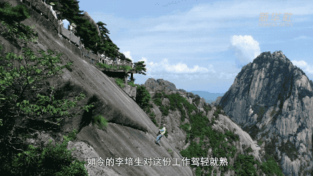 李培生在黃山景區從事環衛保潔工作。他憑借一根繩索,在峭壁上“行走”自如,撿拾掉落的物品。