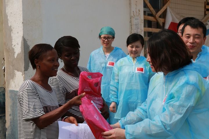 2015年4月4日,在位于塞拉利昂首都弗里敦市郊的中塞友好醫院埃博拉診療中心,中國第四批援塞醫療隊副隊長邵蔚(右前)向被治愈的埃博拉出血熱患者贈送禮物。新華社發(祖榮強 攝)