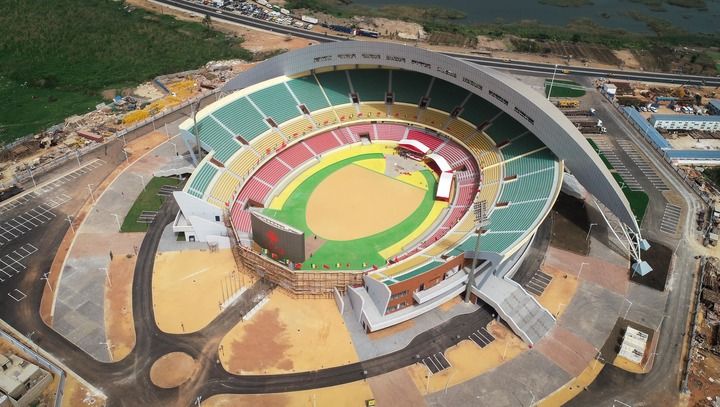 這是2018年7月18日在塞內加爾首都達喀爾航拍的中國援建的塞內加爾競技摔跤場。新華社記者 呂帥 攝