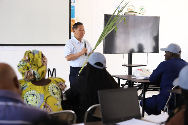 2024年8月4日,在位于盧旺達南方省胡耶區的中國援盧農業技術示范中心,菌草發明人林占熺為培訓班學員講解菌草技術。新華社發(黃萬晴攝)