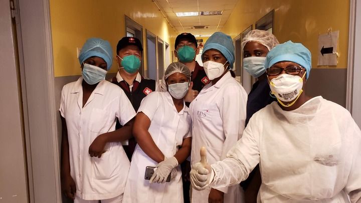 2020年5月26日,中國抗疫醫療專家組在剛果(布)首都布拉柴維爾指導新冠肺炎病房建設時,與當地一線醫務人員合影。新華社發