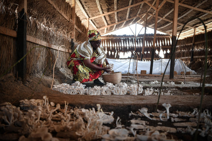 2024年2月6日,在中非共和國達馬拉,法蒂瑪在菇棚內收獲菌草菇。2022年,法蒂瑪在聽說中國菌草專家在班吉傳授技術后主動前往學習,從一間小菌棚起步,逐漸擴大為如今小有名氣的合作社。 新華社記者 韓旭 攝
