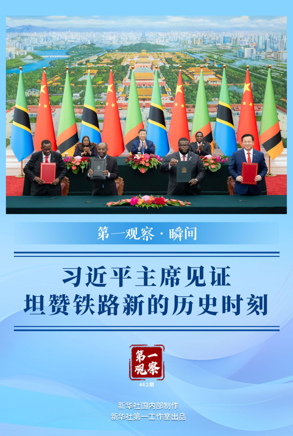 新華社記者用鏡頭記錄下又一歷史時刻——習近平主席同來華出席中非合作論壇北京峰會的坦桑尼亞總統哈桑、贊比亞總統希奇萊馬,在這里共同見證簽署《坦贊鐵路激活項目諒解備忘錄》。簽署完畢,現場熱烈的掌聲經久不息。