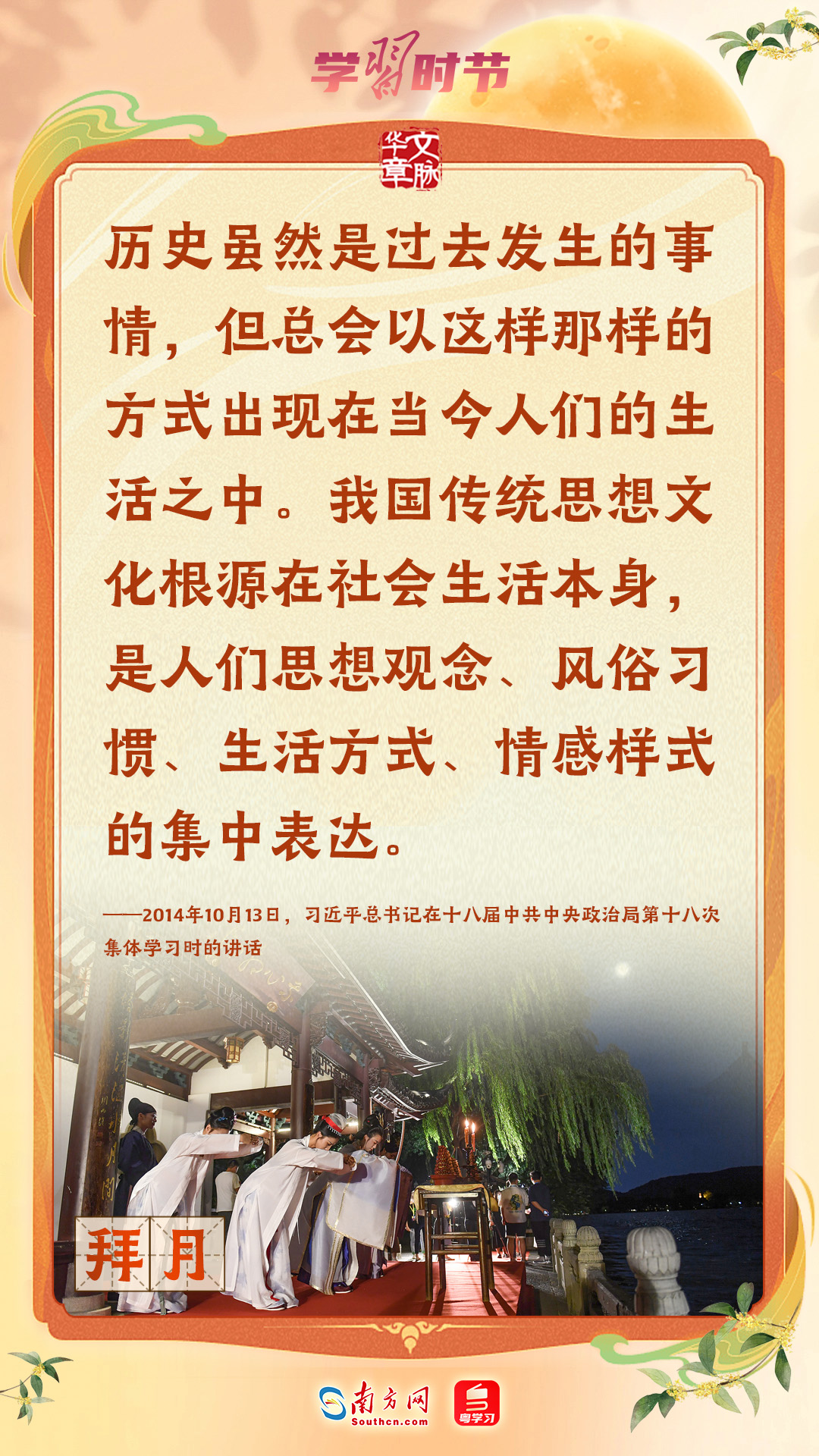 品月餅、賞月拜月、看花燈、飲桂花酒……作為我國重要的傳統節日,中秋節蘊含著中華優秀傳統文化的精髓。習近平總書記一直以來高度重視傳統節日和傳統文化,曾多次強調要發揮其寶貴價值和獨特作用。