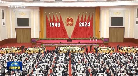 人民大會堂宴會廳華燈璀璨,洋溢著喜慶熱烈的節日氛圍。主席臺上方高懸著莊嚴的國徽,“1949-2024”大字年號在鮮艷紅旗映襯下格外醒目。