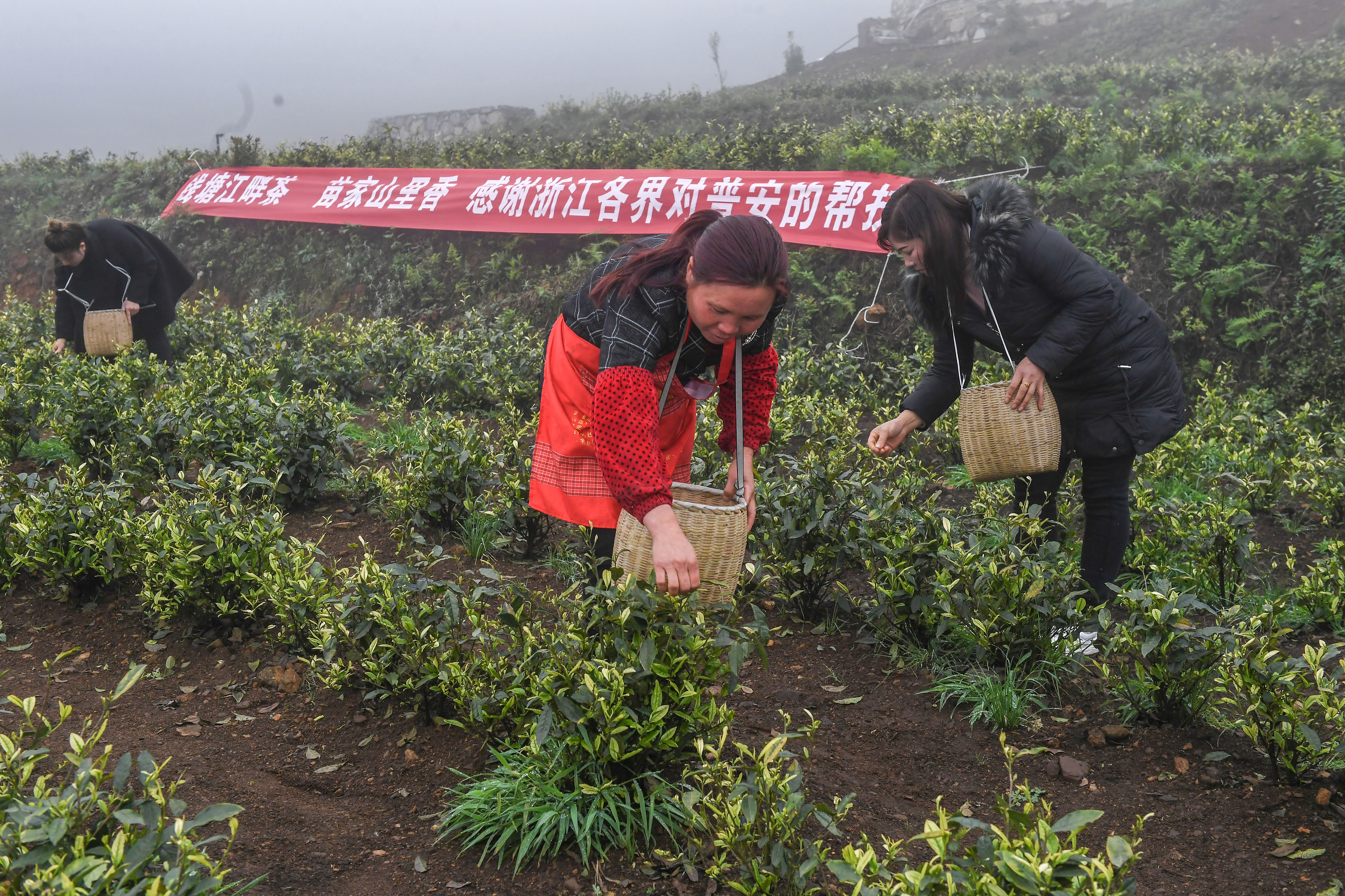 2021年4月14日,工人在貴州省黔西南州普安縣地瓜鎮屯上村“白葉一號”感恩茶園采茶。這片茶園由浙江省安吉縣捐贈。