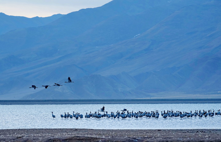 在雅魯藏布江中游河谷黑頸鶴國家級自然保護區,黑頸鶴飛翔在一片水域上空(2024年3月17日攝)。多年來,西藏各級黨委政府和對口援藏省市接續投入2.4億余元資金開展生態建設,創設的雅江北岸南木林生態示范區已完成造林4萬多畝,昔日戈壁荒灘漸變江畔綠洲,也成了黑頸鶴越冬的理想棲息地。監測數據顯示,西藏境內的黑頸鶴種群數量持續增長,已由上世紀的不足3000只增長到目前的1萬余只。