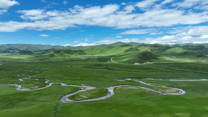 這是2023年7月6日拍攝的甘肅省甘南藏族自治州瑪曲縣阿萬倉濕地景色(無人機照片)。瑪曲縣是黃河上游重要的水源涵養區和生態功能區,被稱為“黃河之腎”。多年來,甘肅省實施退牧還草、退化草原生態修復等治理工程,草原生態環境明顯改善。