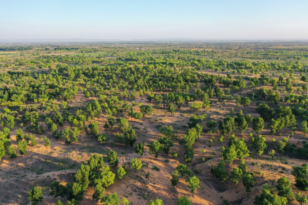 2023年6月14日在內蒙古毛烏素沙地拍攝的當地牧民種植的一片樹林(無人機照片)。2024年以來,內蒙古全面開展“三北”工程攻堅戰,已完成防沙治沙面積約1954萬畝,約為年度總任務1730萬畝的113%,超額完成年度任務。