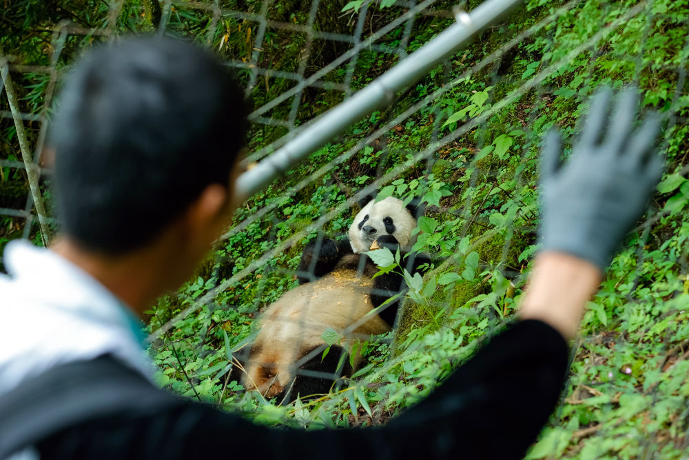 2024年6月24日,在位于大熊貓國家公園臥龍片區內天臺山的大熊貓第二階段野化培訓場外,工作人員給母熊貓“賢賢”投喂完食物后揮手向其告別。近年來,我國通過大力實施天然林保護、野生動植物保護和大熊貓國家公園建設等,保護大熊貓及其棲息地,成效顯著。大熊貓野外種群總量已從20世紀80年代的約1100只增長到近1900只。